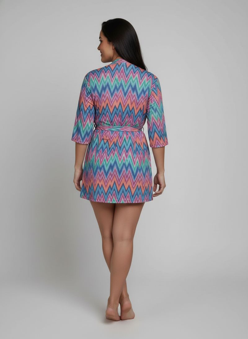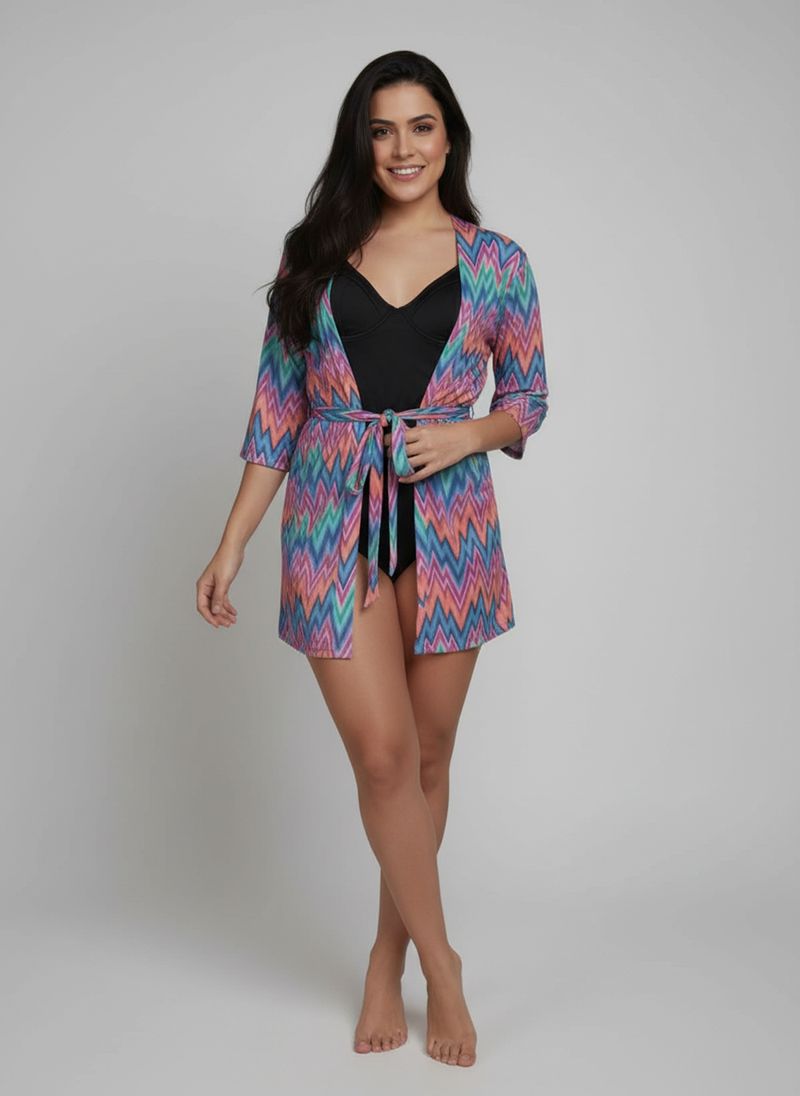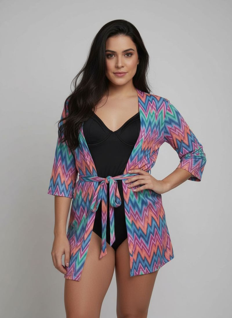 Deslumbre-se com a Saída de Praia Kimono Feminino Chevron Vibrante Caedu. Confeccionada em 100% viscose, oferece leveza e caimento fluido para seus momentos de lazer. Sua estampa vibrante e amarração na cintura garantem um visual único e confortável, elevando sua moda praia com estilo acessível.