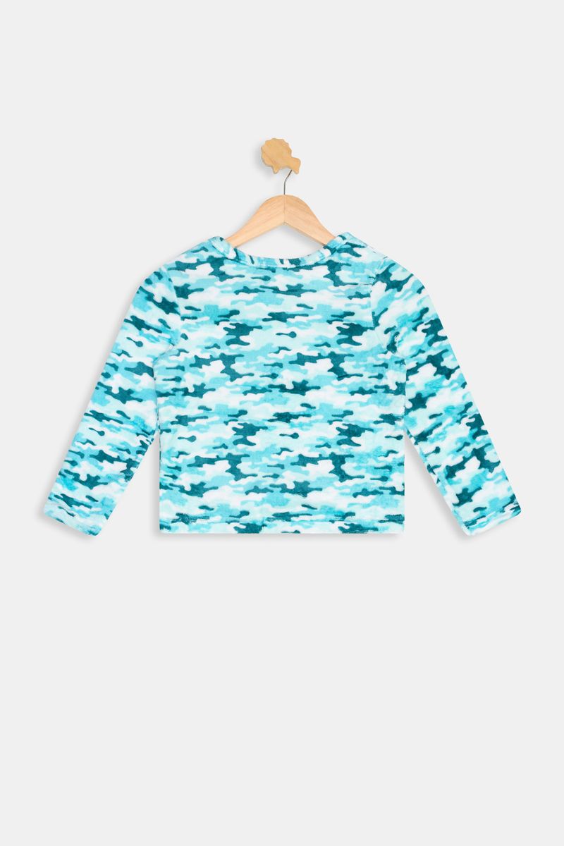 Conforto e suavidade no Pijama Infantil Estampado Camuflagem Azul Água Aconchegante Caedu. Em fleece 100% poliéster, este conjunto de blusa e calça com estampa camuflagem azul é a roupa infantil.