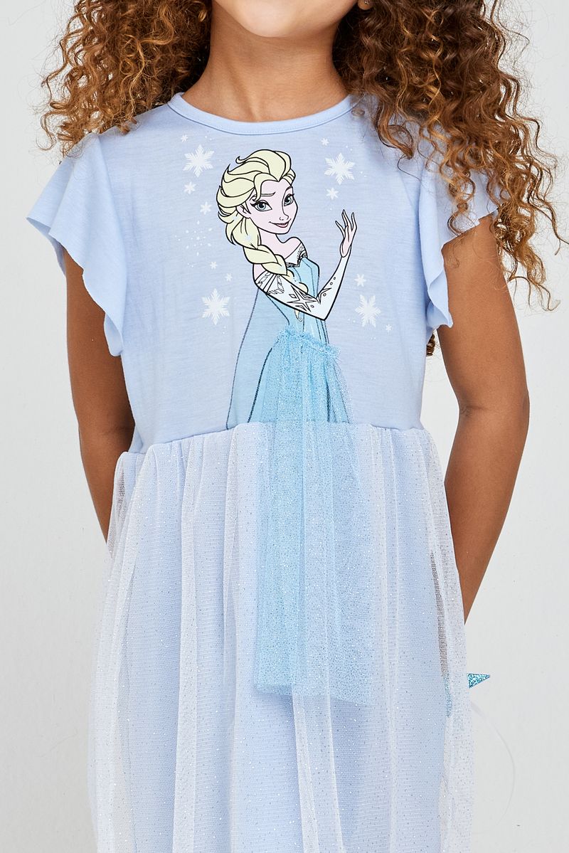 Camisola Infantil Frozen Elsa Azul Gelo com Tule Brilhante Caedu