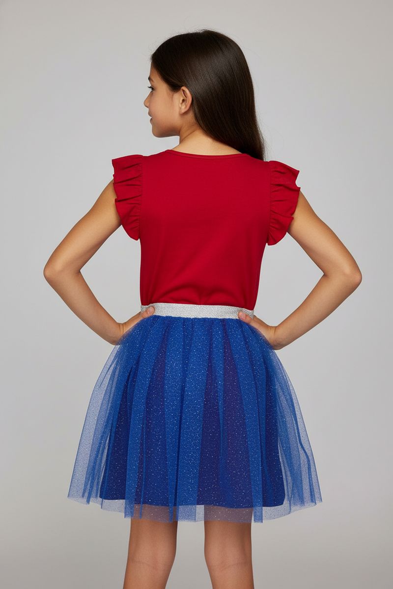 Detalhes: Estampa Homem-Aranha, mangas com babados, saia de tule azul com glitter