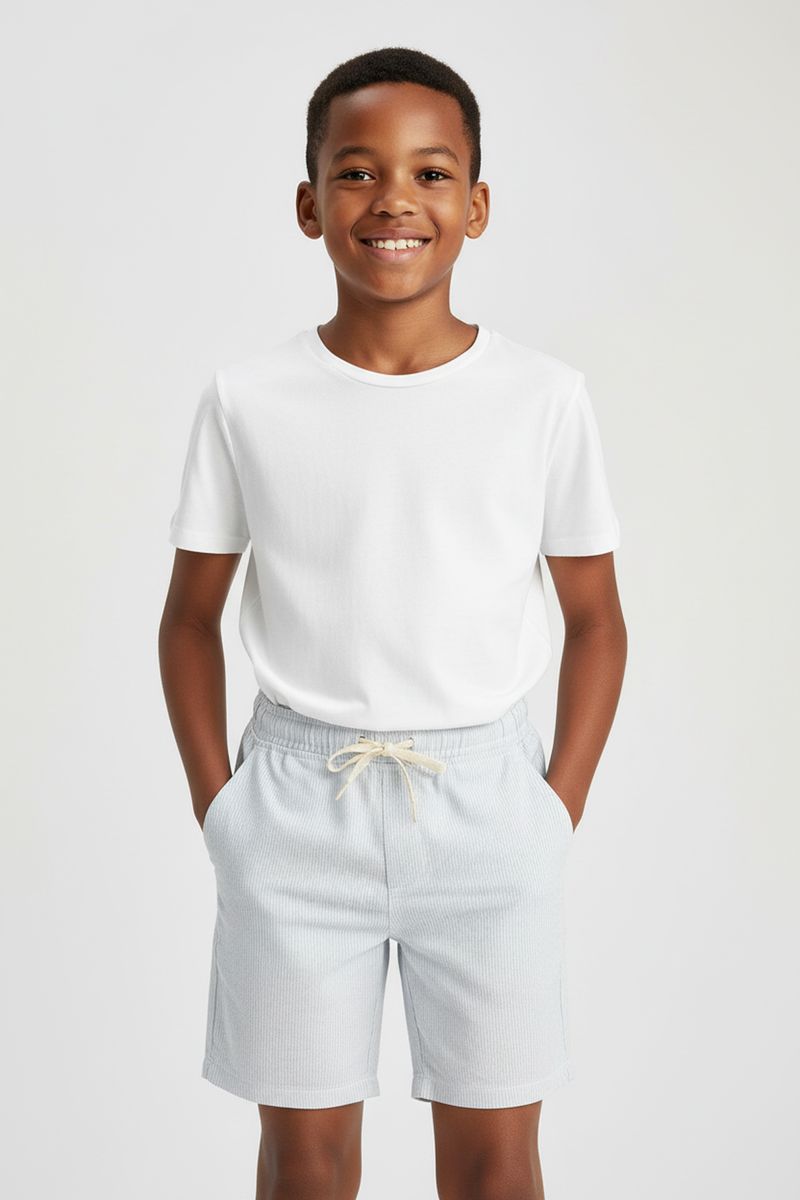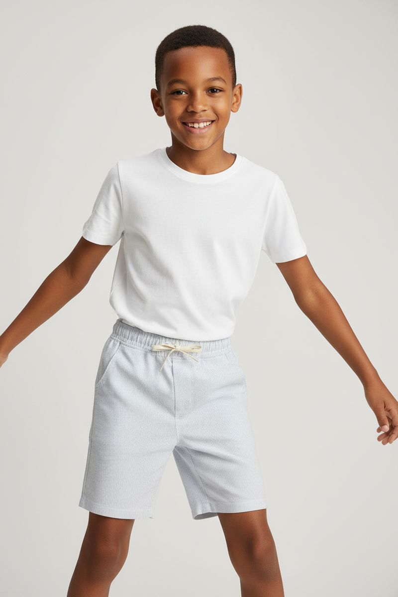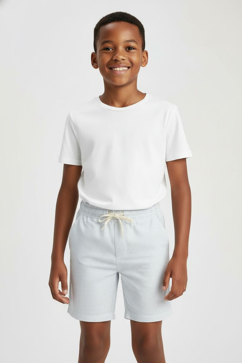 Explore o mundo com o Shorts Infantil de Sarja Eco Caedu. Confeccionado em sarja eco com algodão e elastano, oferece conforto e liberdade. Seu design listrado azul claro, cintura elástica e cordão ajustável garantem um look cheio de estilo para as aventuras diárias.