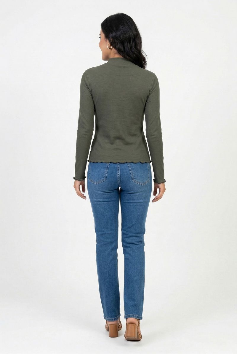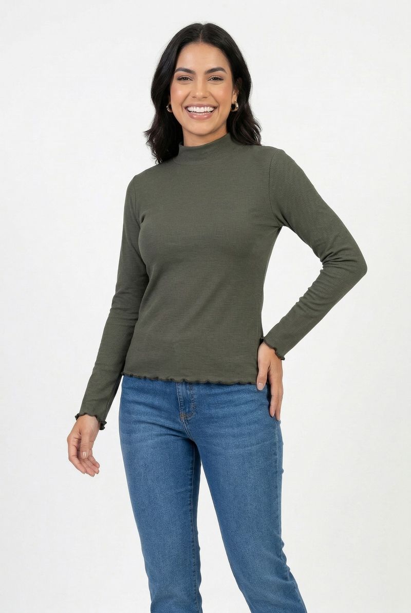 VestuárioFemininoBlusas e CamisetasBlusa fem cas m/l ribana gola alta verde verde escuro