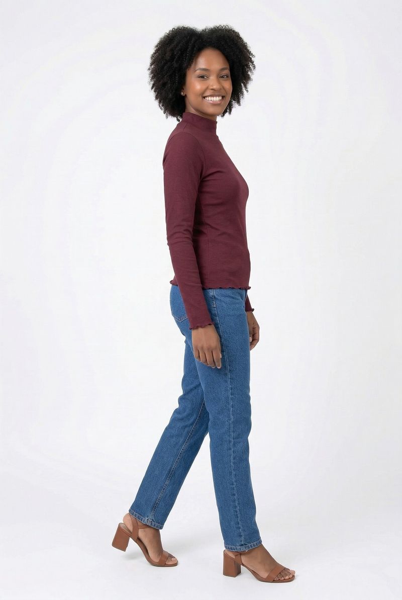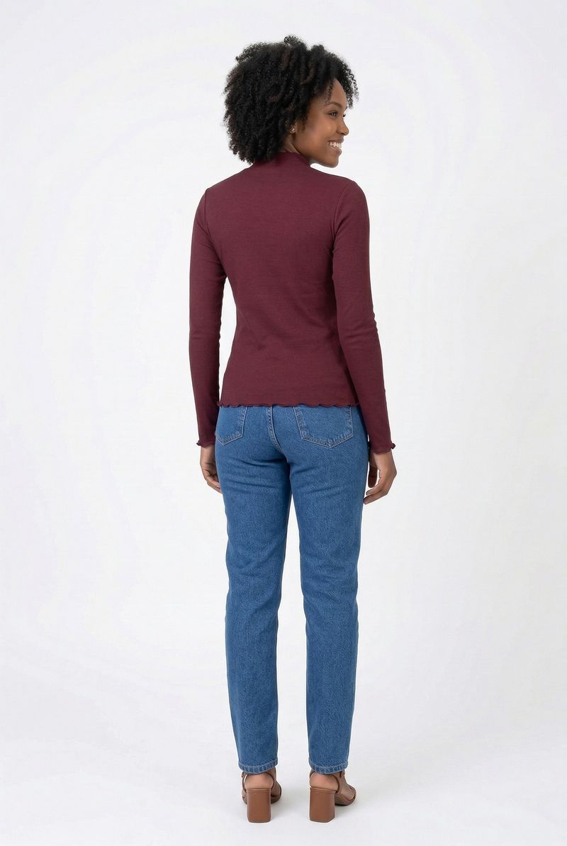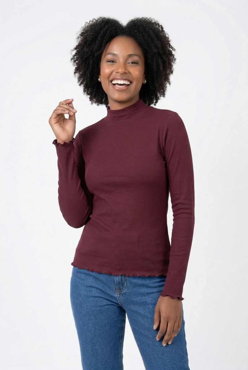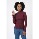 Eleve seu estilo com a Blusa Feminina Gola Alta Canelada Vinho Caedu. Confeccionada em ribana, esta peça de manga longa oferece conforto e sofisticação. Seu design canelado e o acabamento ondulado garantem um visual moderno.