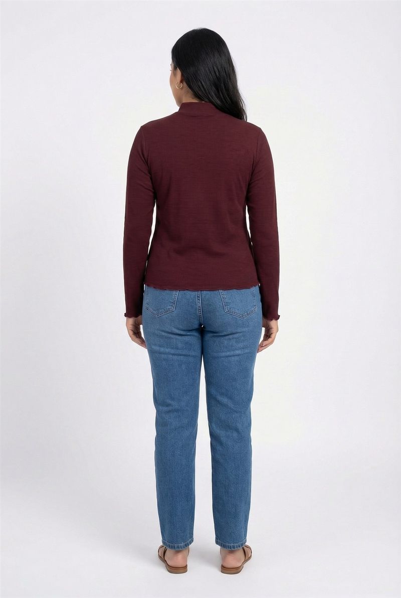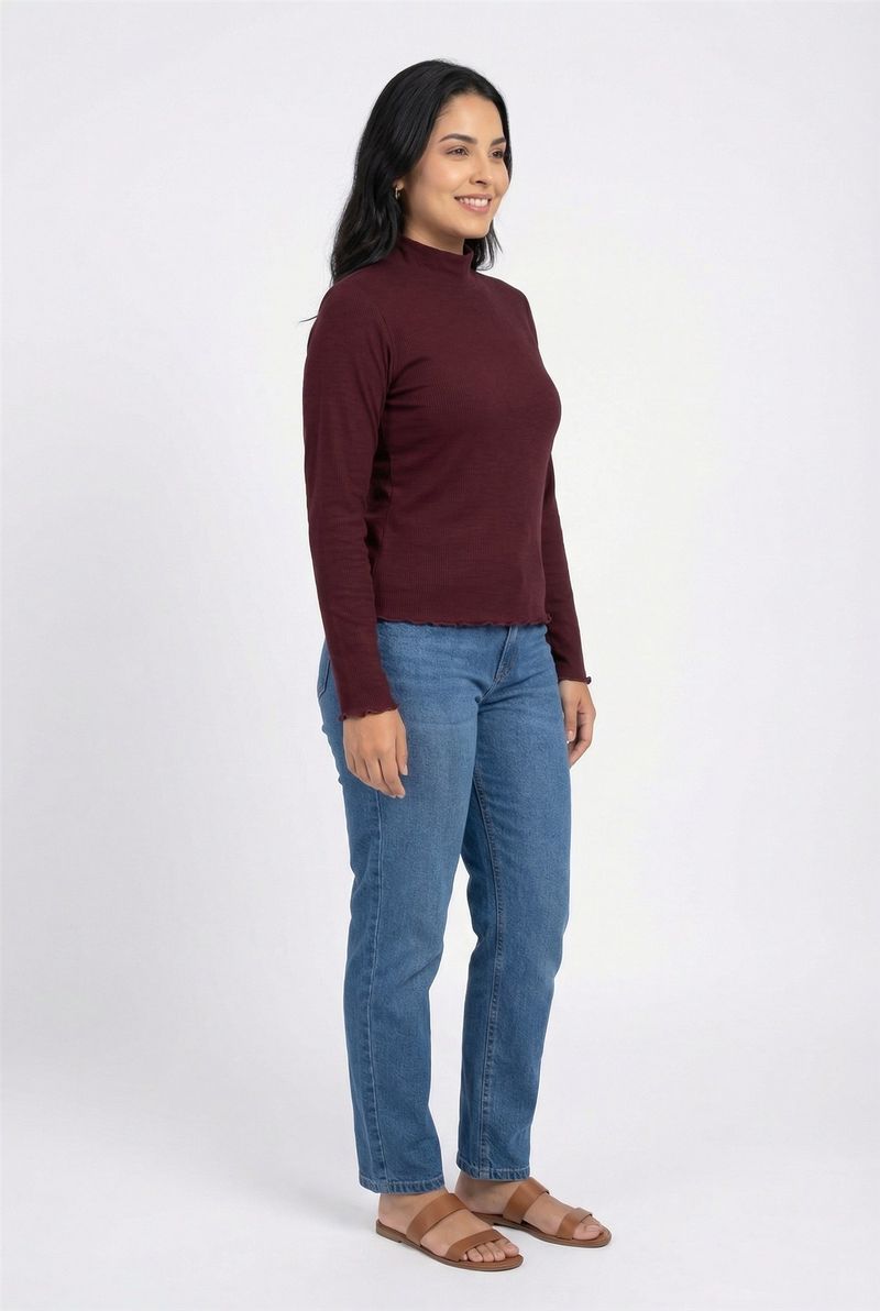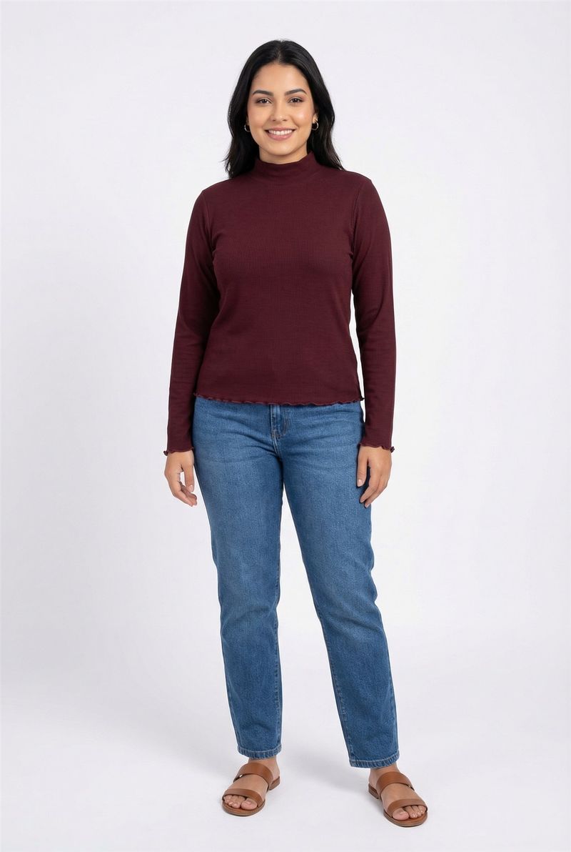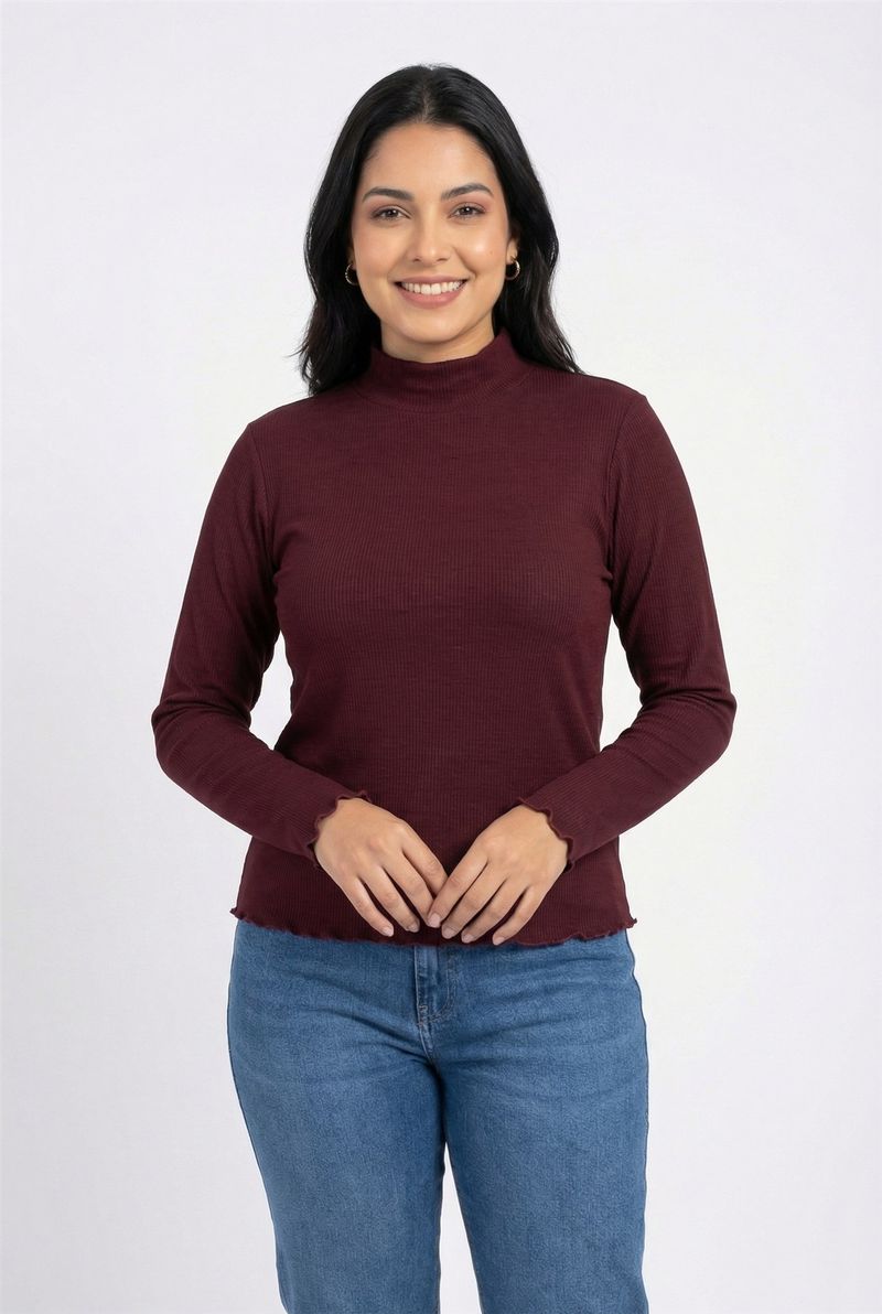 Desfrute do conforto e estilo com o Suéter Feminino Gola Alta Canelado Vinho Roxo Caedu. Sua textura canelada, gola alta e detalhes ondulados nos punhos e barra oferecem um toque delicado e elegante, perfeito para a moda feminina.