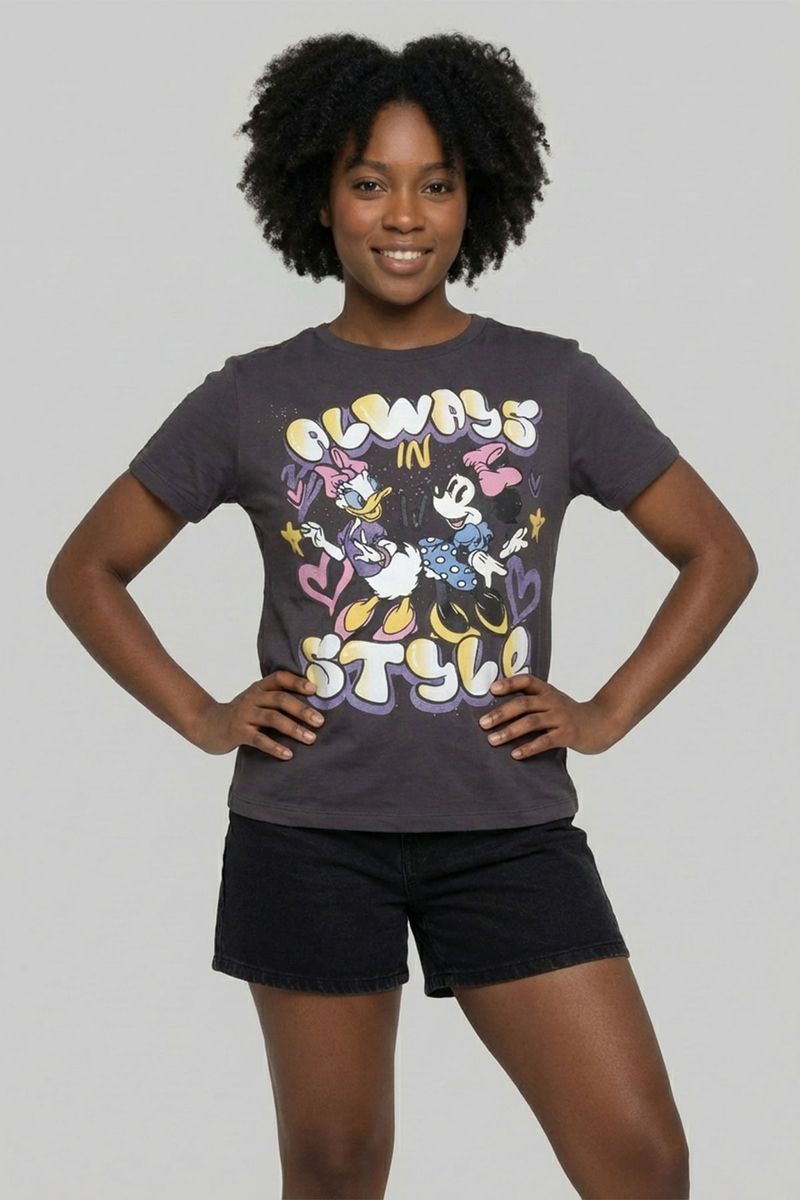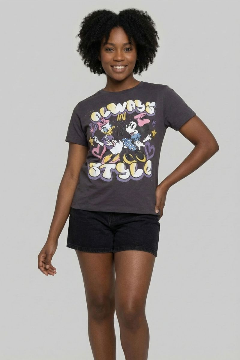 Vista a magia Disney com a Blusa Feminina Caedu Minnie e Margarida. Em grafite cinza escuro, esta peça oferece conforto inigualável com meia malha 100% algodão. Ideal para um visual divertido e estiloso.