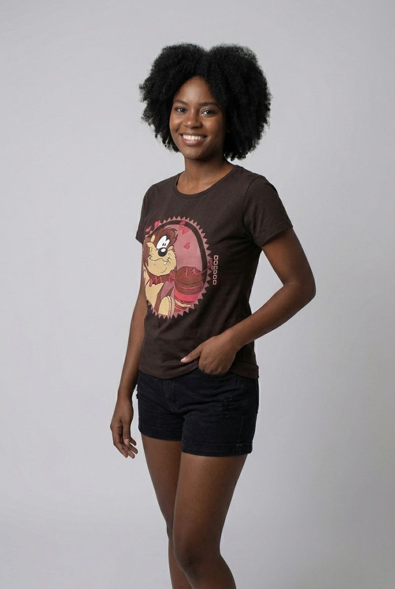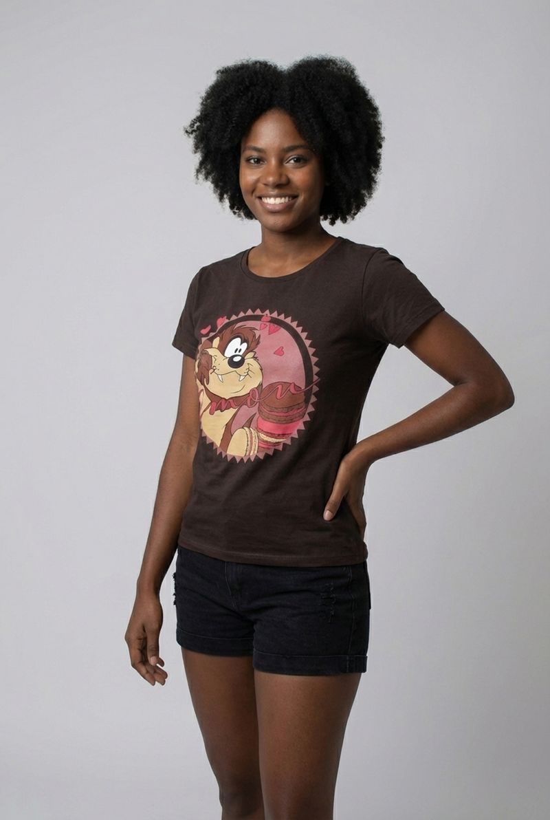 Sinta a alegria e o conforto com a Blusa Feminina Taz Mania Macarons e Corações Marrom Caedu. Confeccionada em algodão puro e meia malha, esta peça oferece toque suave e caimento perfeito. Sua estampa exclusiva com o divertido Taz Mania, macarons coloridos e delicados corações adiciona um charme único ao seu visual, ideal para quem busca estilo e bem-estar.