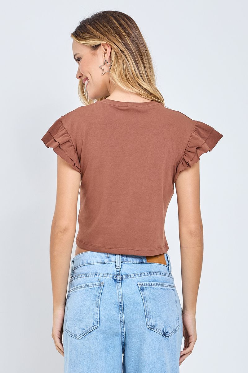 A Blusa Feminina Manga Curta Marrom com Babados Charmosos da Caedu é a peça ideal para quem busca moda e conforto. Confeccionada em COTTON, oferece um toque suave e caimento perfeito. Seus babados nas mangas adicionam um charme único, elevando qualquer look. Uma escolha versátil para o seu guarda-roupa Caedu.