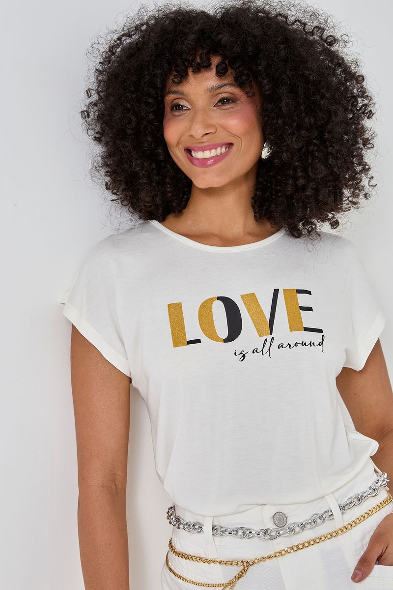 A Blusa Feminina Caedu Off White Love Is All Around Dourada, em viscolycra, oferece conforto. A estampa 'Love Is All Around' com detalhes dourados adiciona moda e positividade às roupas Caedu.