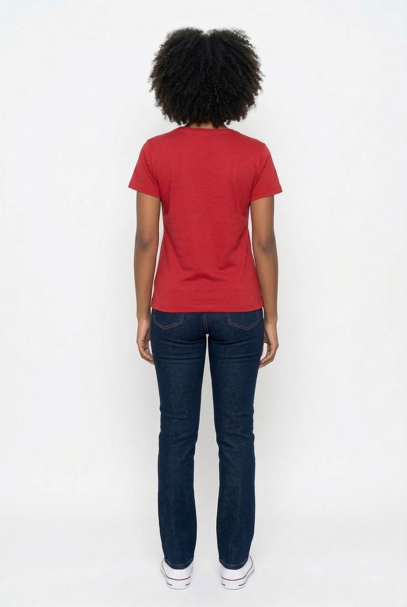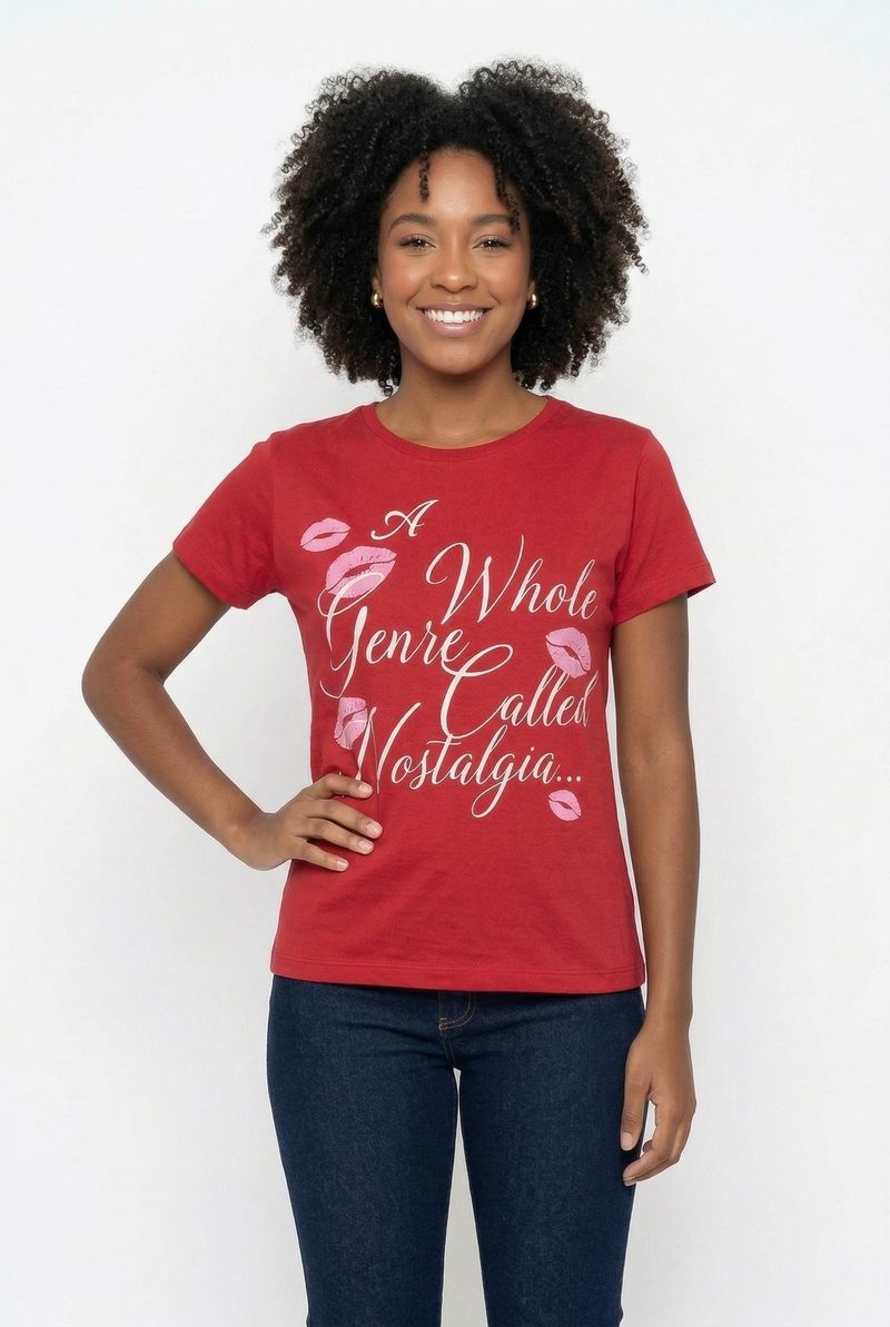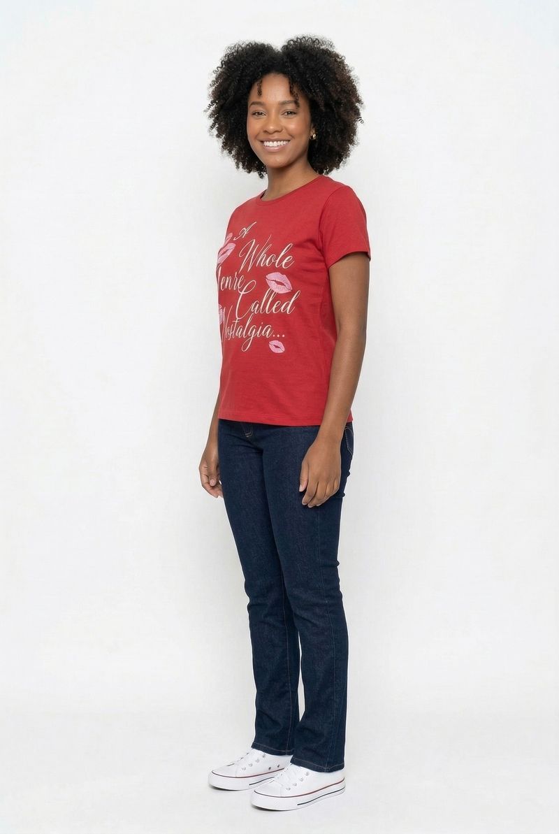 Sinta o conforto e o estilo da T-shirt Feminina Caedu. Com sua cor vermelha vibrante e estampa exclusiva de nostalgia com lábios pink, esta roupa de 100% algodão em meia malha oferece um toque macio e caimento perfeito. Ideal para quem busca moda e personalidade em uma peça versátil.