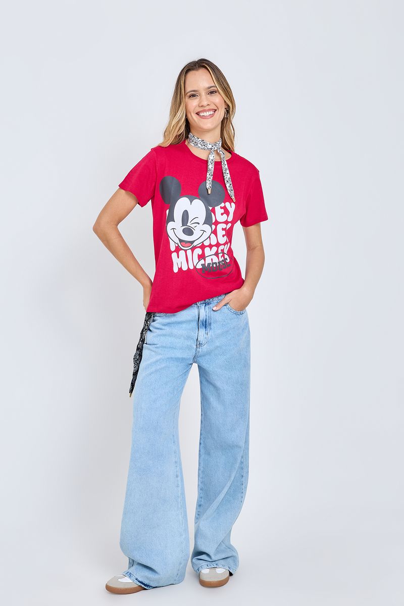 A Blusa Feminina Vermelha Mickey Mouse Piscando Caedu traz a magia Disney. Feita em meia malha 100% algodão, oferece conforto e leveza. Sua estampa vibrante do Mickey piscando garante um look divertido e estiloso, ideal para suas roupas.