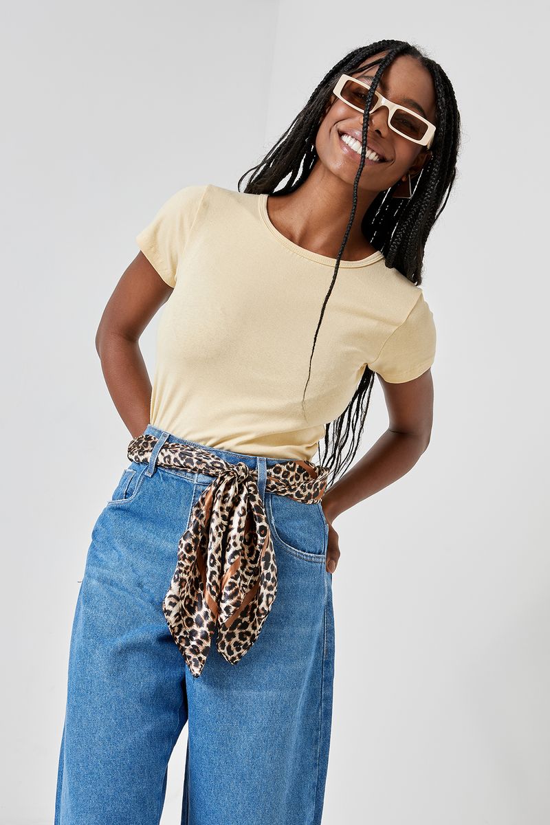 Combine sua blusa amarela clara com calças jeans para um visual despojado e moderno. Para um toque de elegância, adicione um lenço estampado e óculos de sol. Nos pés, tênis brancos ou sandálias rasteirinhas complementam o look, criando um estilo casual chic ideal para diversas ocasiões.