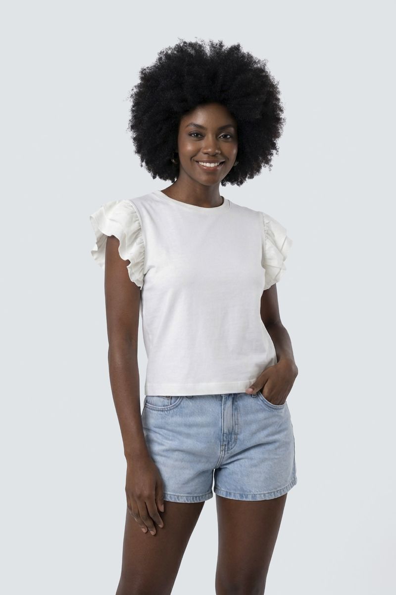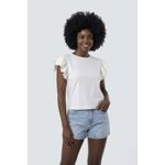 Sinta a leveza e o estilo com a Camiseta Feminina Off White com Mangas de Babados Caedu. Confeccionada em algodão e elastano, oferece conforto e caimento perfeito. Seu design moderno com babados nas mangas adiciona um toque de charme à sua roupa, ideal para um visual elegante e versátil.