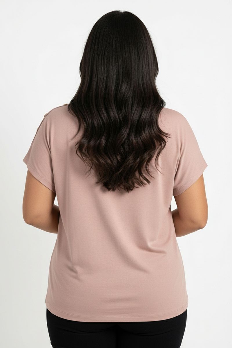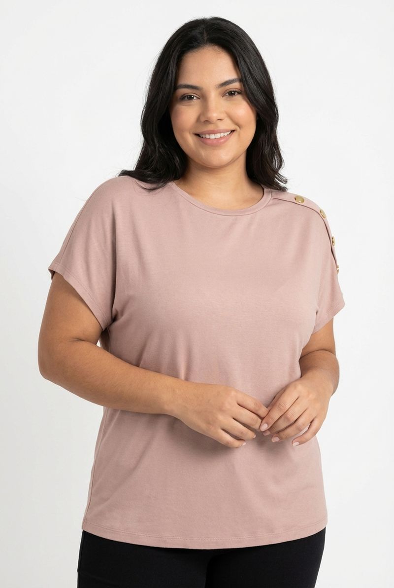 Sinta a leveza da Blusa Manga Curta Caedu, um toque de sofisticação para seu dia a dia. Com seu design em malha bege rosê e detalhes de botões dourados no ombro, esta peça oferece caimento solto e decote redondo, ideal para quem busca conforto e estilo. Uma peça versátil para o guarda-roupa feminino.