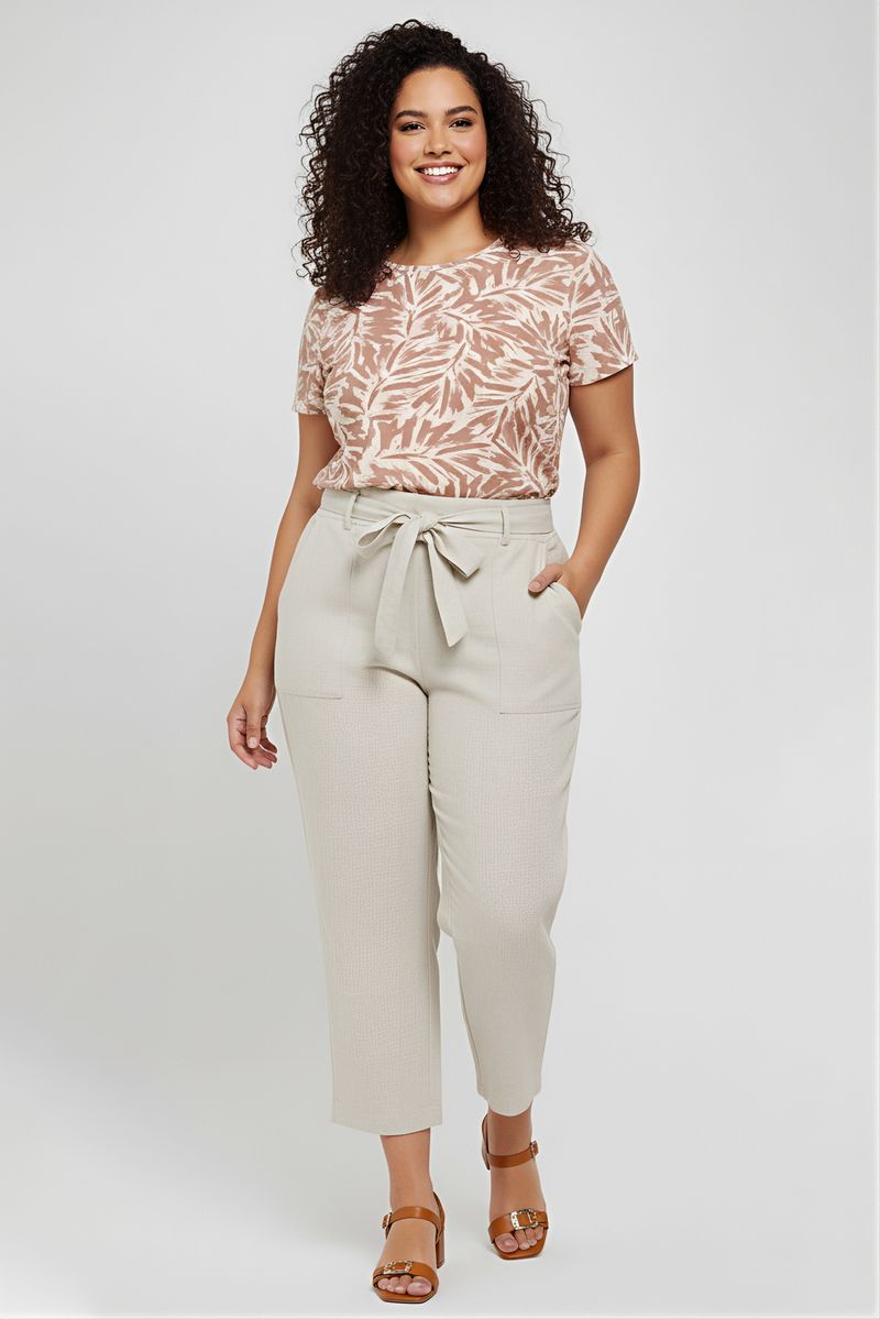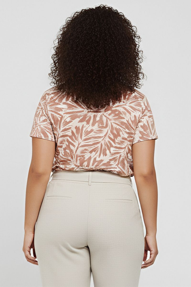 Combine a blusa com uma calça de cintura alta bege ou off-white para um visual elegante e despojado, como visto na imagem. Para um toque casual, aposte em shorts jeans e tênis. Complete com sandálias de salto bloco marrom ou rasteirinhas para um look confortável e estiloso. Adicione acessórios neutros para realçar a estampa.