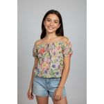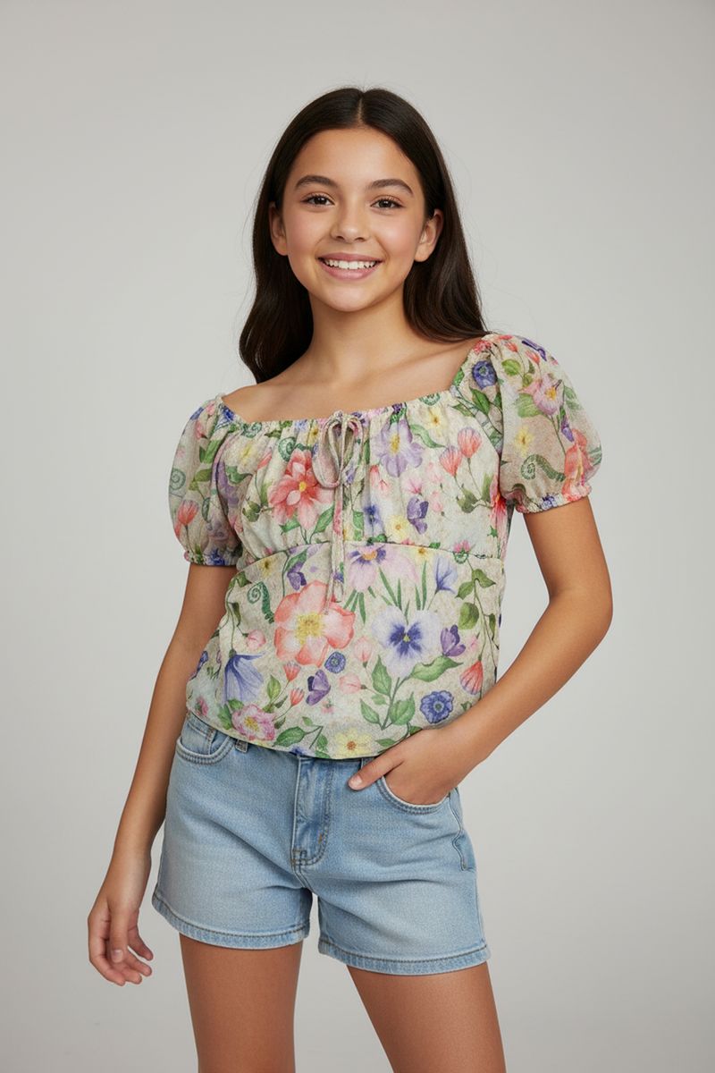 A Blusa Ciganinha Juvenil Floral Caedu em tule estampado é a escolha perfeita para meninas que amam moda! Com seu design ombro a ombro, estampa floral vibrante e detalhes de amarração, esta blusa oferece um visual moderno e confortável, ideal para expressar seu estilo único.