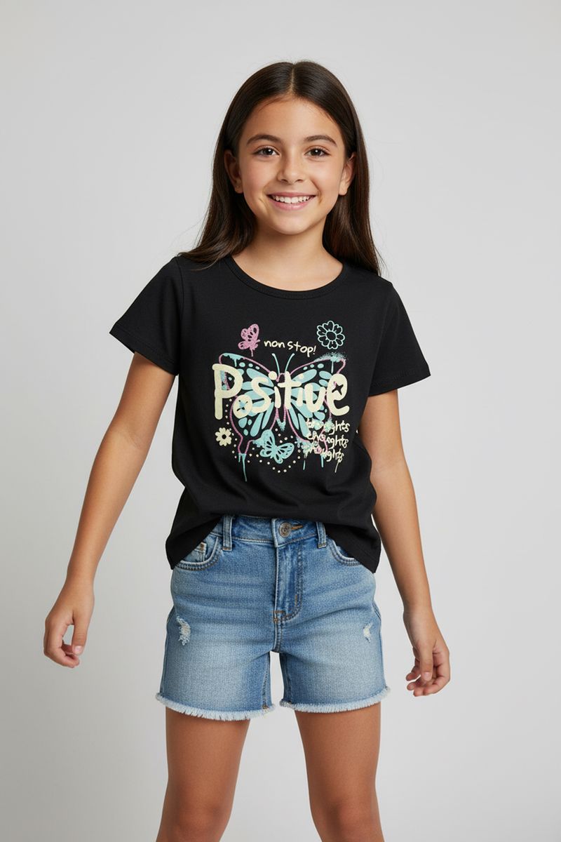 positividade para as meninas. Com uma estampa colorida de borboleta e a palavra "POSITIVE", esta