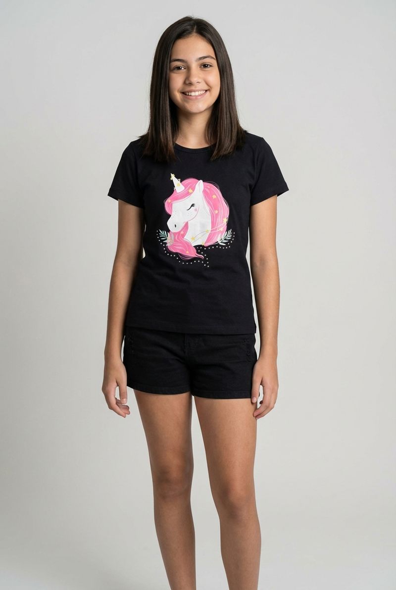 Desperte a magia no guarda-roupa da sua pequena com a Blusa Infantil Feminina Unicórnio Encantado Caedu. Confeccionada em cotton silk, esta blusa preta estampada oferece conforto e estilo. O design vibrante do unicórnio com crina rosa e detalhes brilhantes inspira sonhos e aventuras, tornando-a uma peça essencial para o dia a dia da moda infantil.