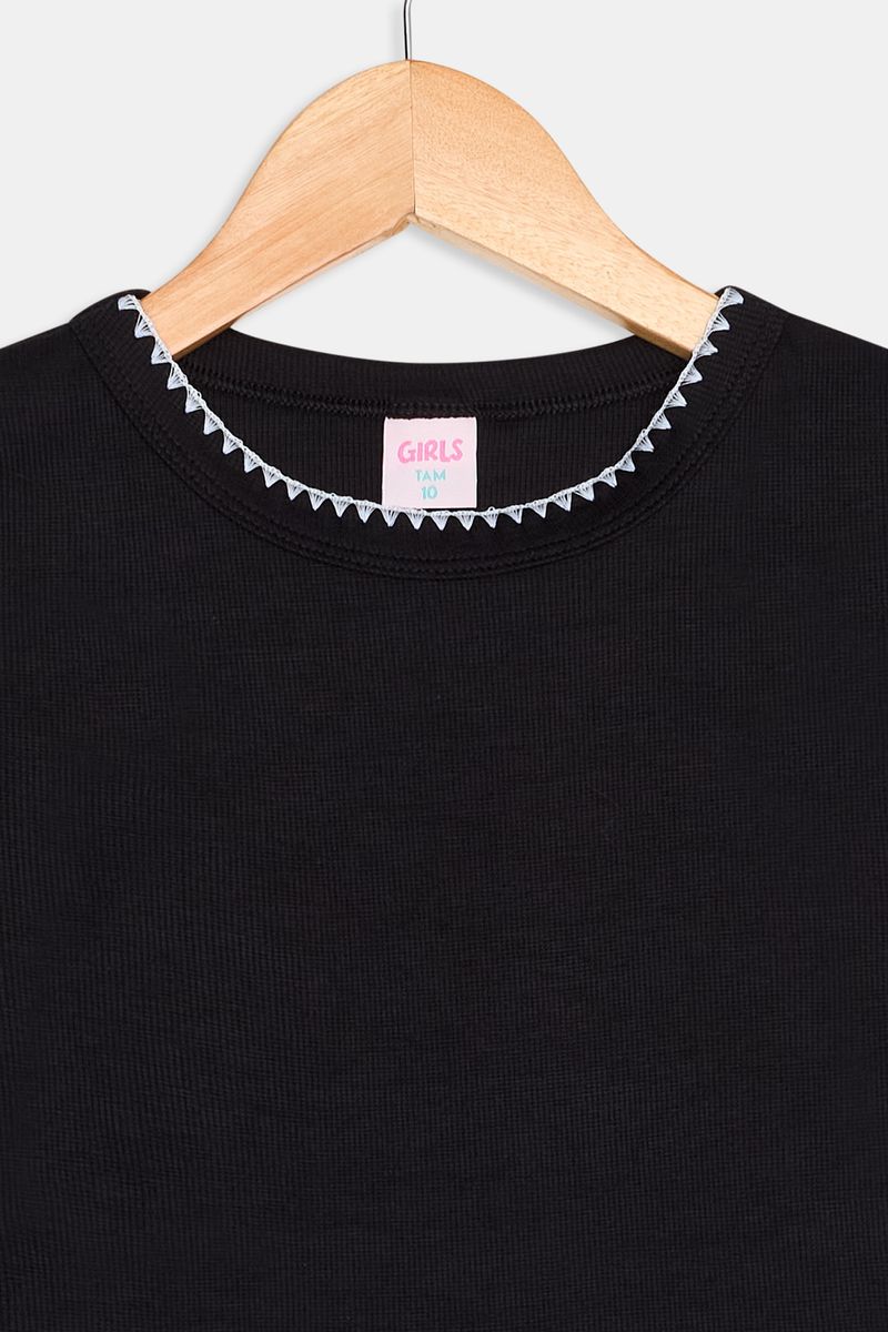 A Blusa Infantil Caedu preta oferece estilo e conforto. Confeccionada em ribana 100% poliéster, destaca-se pelos delicados detalhes picuet na gola redonda. Uma peça versátil e charmosa para looks modernos da moda infantil Caedu. Ideal para o dia a dia.