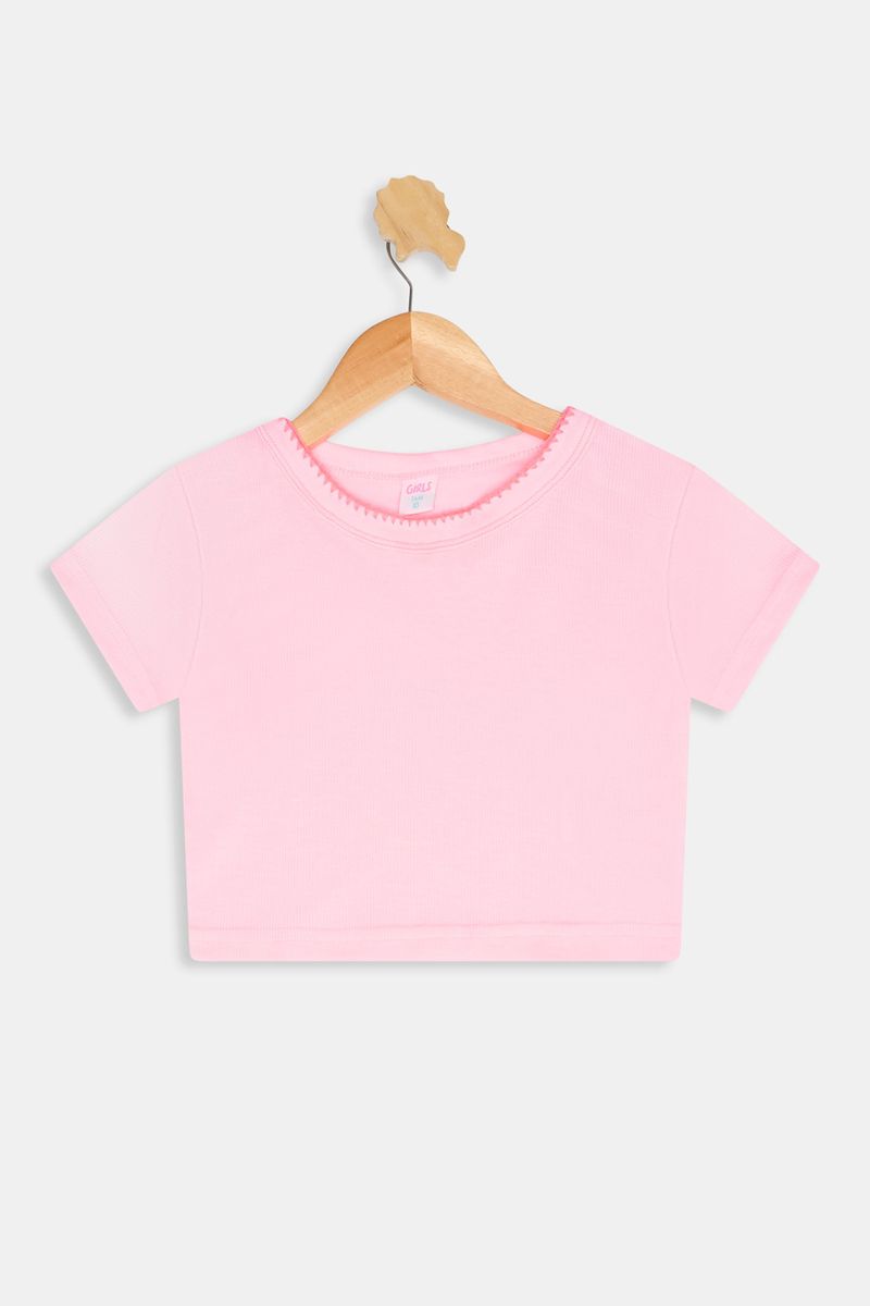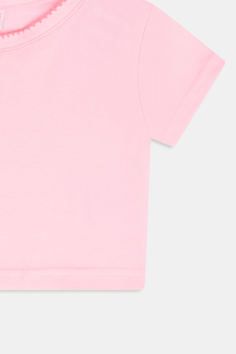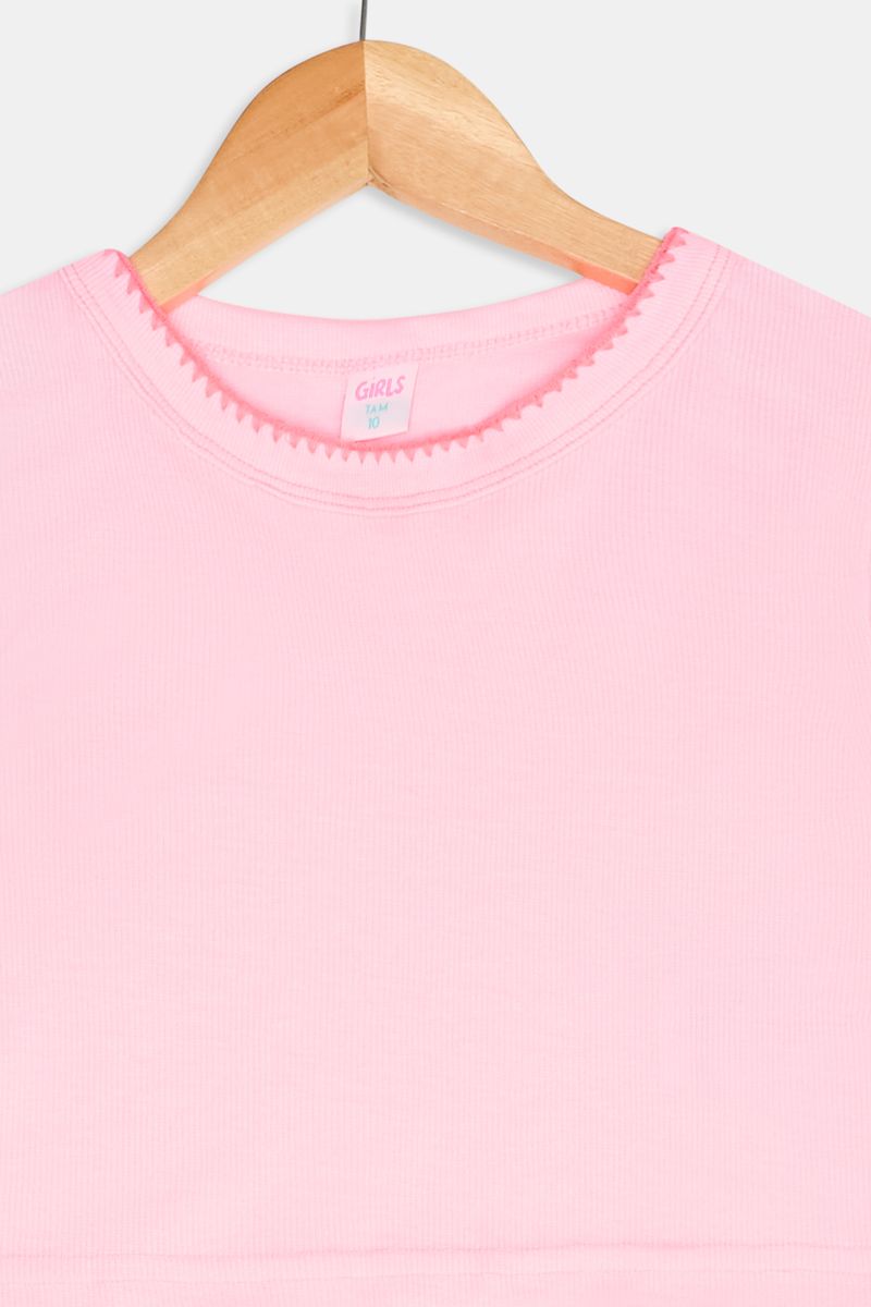 Detalhes: Detalhe picuet na gola, cor rosa neon vibrante, textura canelada, gola redonda, mangas curtas, barra reta