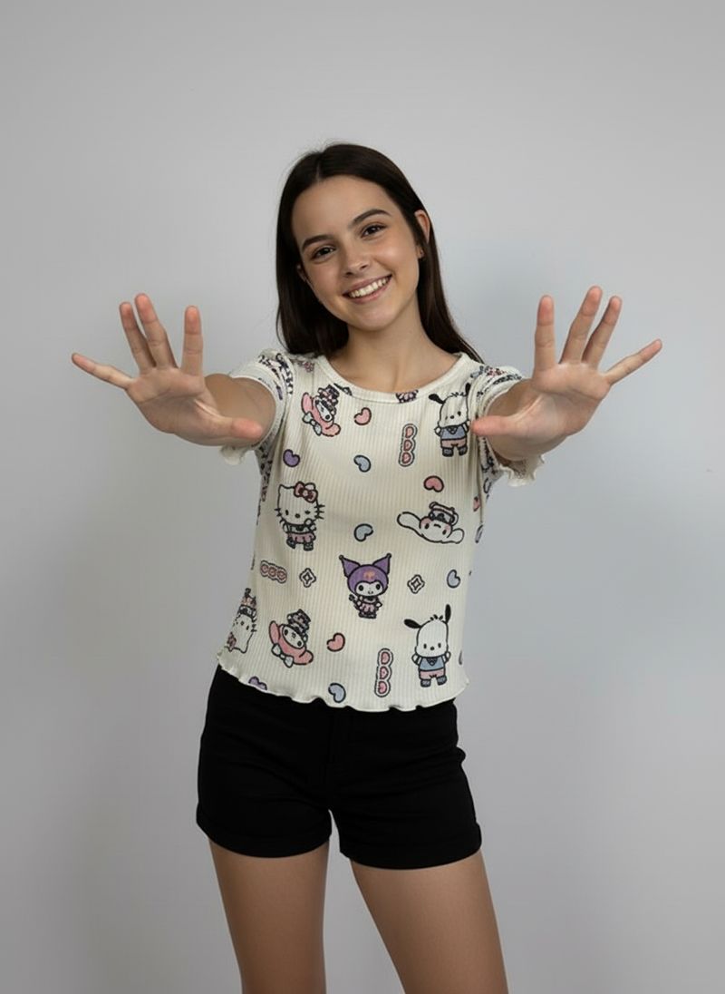 Combine esta blusa vibrante com um shorts jeans para um look casual e divertido. Para um toque mais despojado, uma saia rodada e tênis coloridos são ideais. Complete o visual com laços de cabelo ou uma mochila temática dos personagens Sanrio, criando um estilo único e cheio de personalidade para as pequenas.