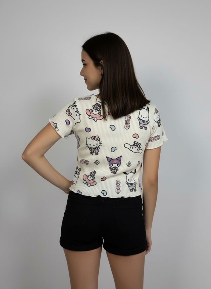 A Blusa Cropped Canelada Hello Kitty e Amigos Sanrio Off White Caedu é perfeita para as pequenas fashionistas. Com estampa vibrante dos seus personagens favoritos e tecido em meia malha canelada, oferece conforto e estilo para o dia a dia. Uma peça essencial na moda infantil.