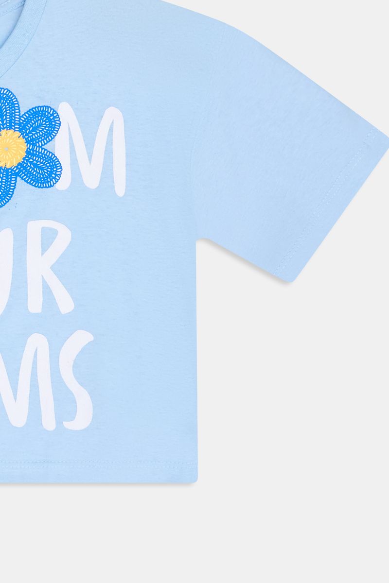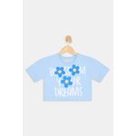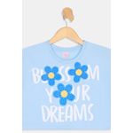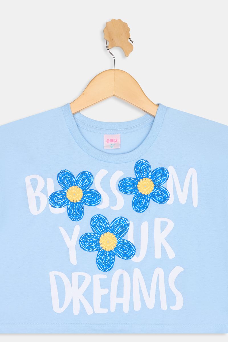 Vista a Blusa Infantil Caedu Silk Flor e inspire-se! Feita em 100% algodão, oferece conforto e leveza para o dia a dia. Com sua estampa 'BLOSSOM YOUR DREAMS' e detalhes florais, esta roupa azul claro é perfeita para meninas que amam moda e mensagens positivas. Encontre na Caedu loja virtual!
