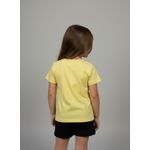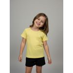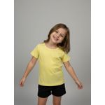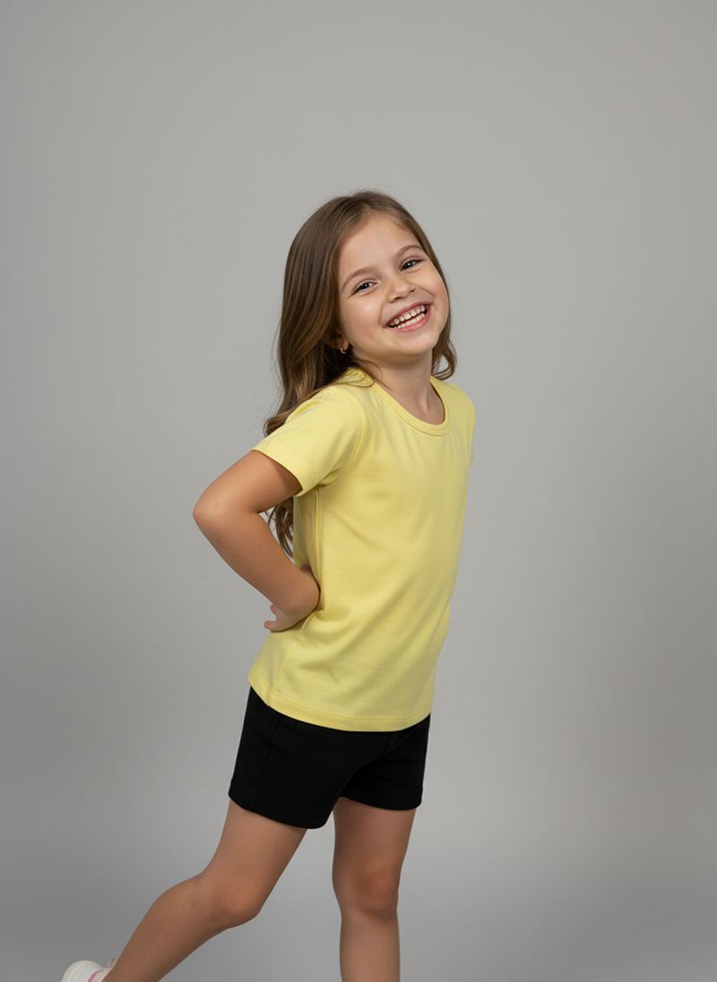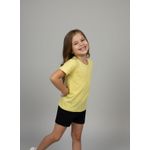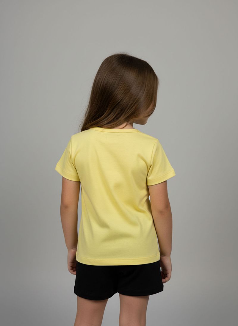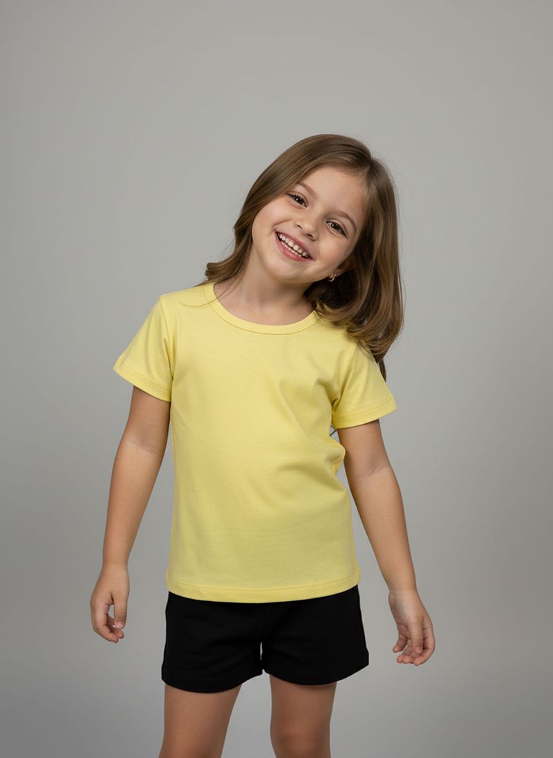 Combine esta blusa amarela com shorts pretos para um look casual e divertido. Para um visual mais despojado, use com jeans ou saias coloridas. Complete com tênis confortáveis ou sandálias para um toque final de estilo. Uma peça versátil para diversas combinações de roupas infantis.