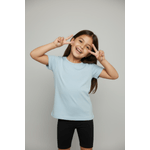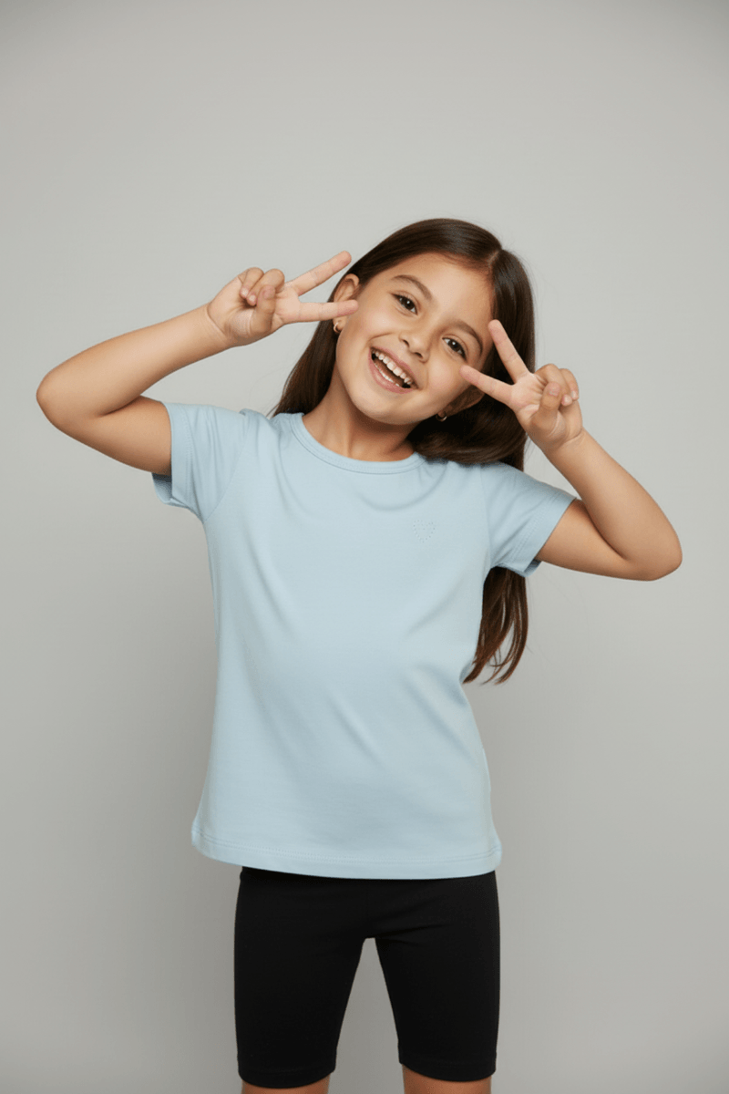 Combine esta blusa azul claro com shorts jeans para um visual despojado e moderno. Para um toque mais divertido, experimente com uma saia estampada. Nos pés, tênis coloridos ou sapatilhas complementam o look com charme. Adicione uma jaqueta leve para as noites mais frescas, criando um conjunto versátil e cheio de personalidade para sua pequena, sempre com a moda Caedu.