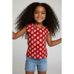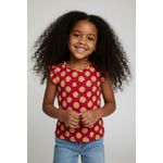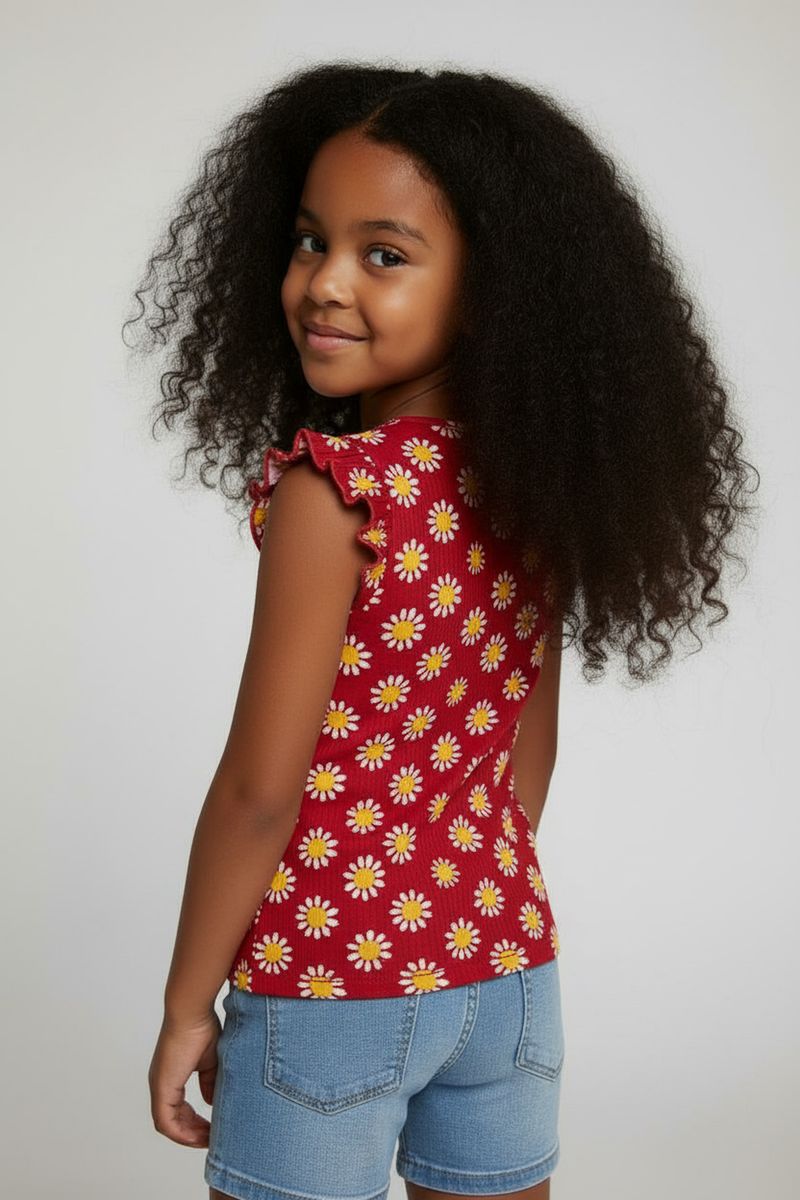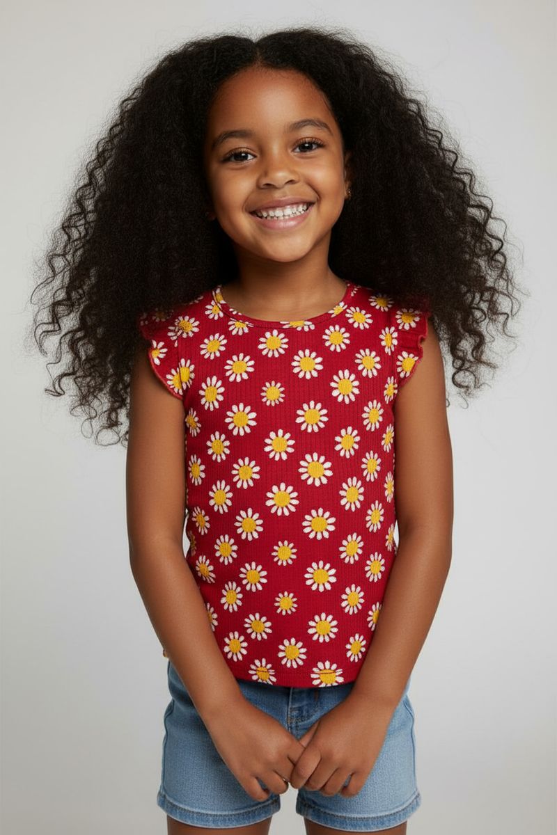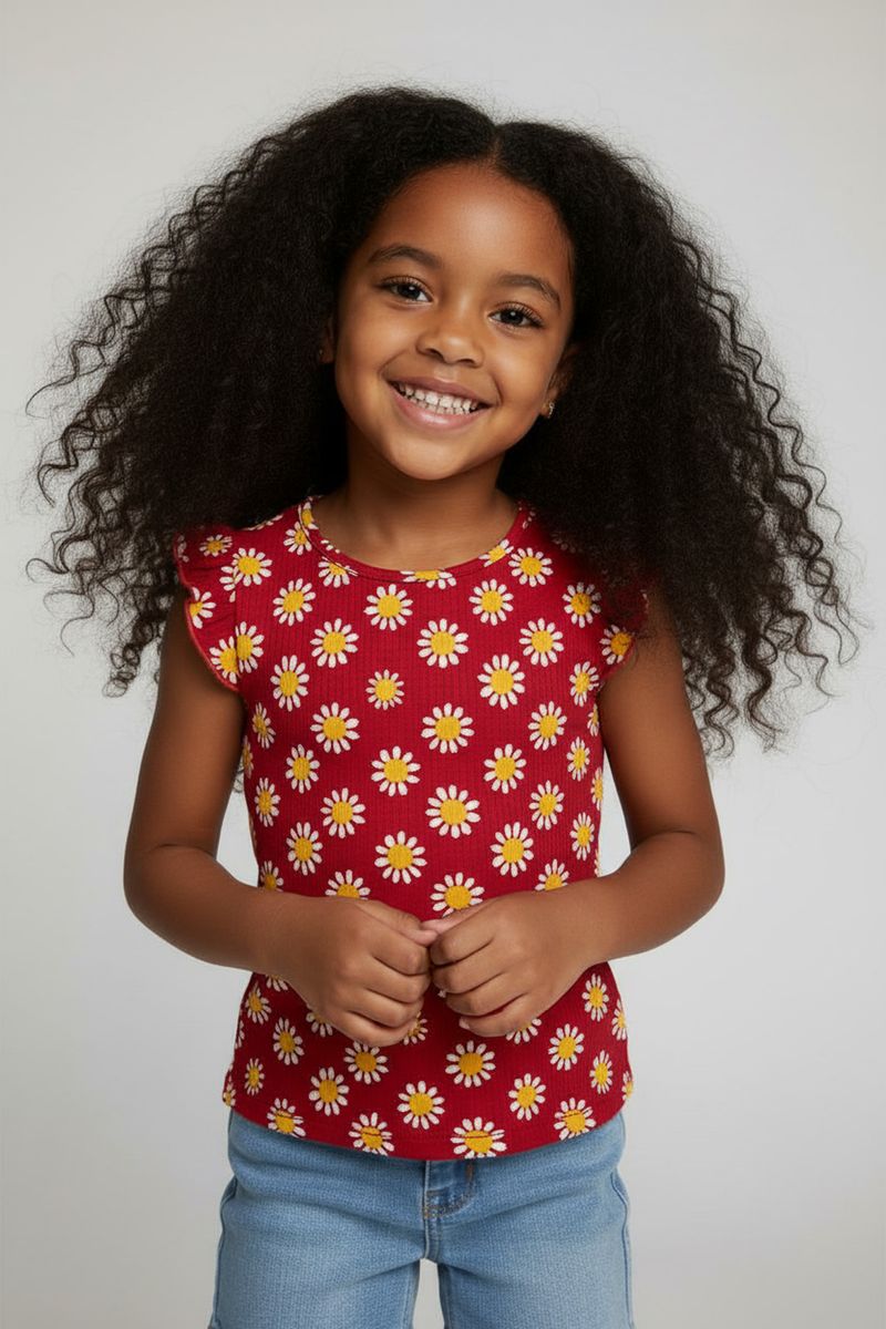 A Blusa Infantil Caedu de Ribana Vermelha oferece conforto e estilo para sua menina. Com estampa de margaridas vibrantes e babado nas mangas, esta roupa infantil é perfeita para looks encantadores e duradouros no dia a dia.