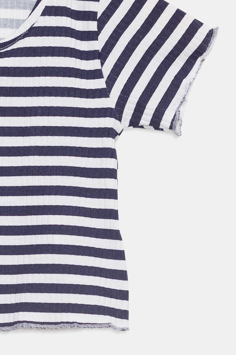 Combine esta blusa listrada com shorts jeans para um visual casual e despojado. Para um toque mais arrumado, use com uma saia plissada e tênis brancos. Nos dias mais frescos, adicione uma jaqueta jeans ou um cardigã leve. Acessórios como óculos de sol e um colar delicado complementam o look com charme.