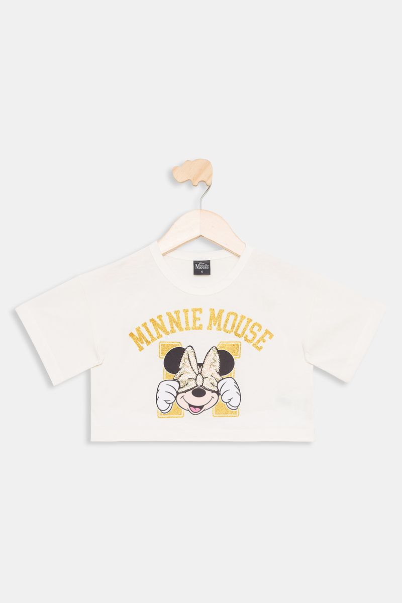 A Blusa Infantil Minnie com Paetê Off White Caedu é perfeita para um look charmoso e confortável. Em algodão de meia malha, oferece toque suave e liberdade. A estampa da Minnie com paetês brilhantes e glitter dourado adiciona um toque mágico, ideal para moda infantil com preço bom.