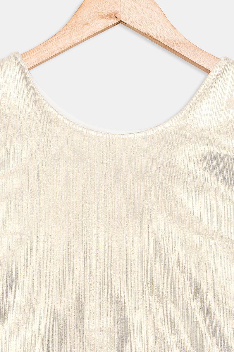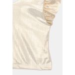 Detalhes: Acabamento metálico, mangas curtas bufantes, gola canoa