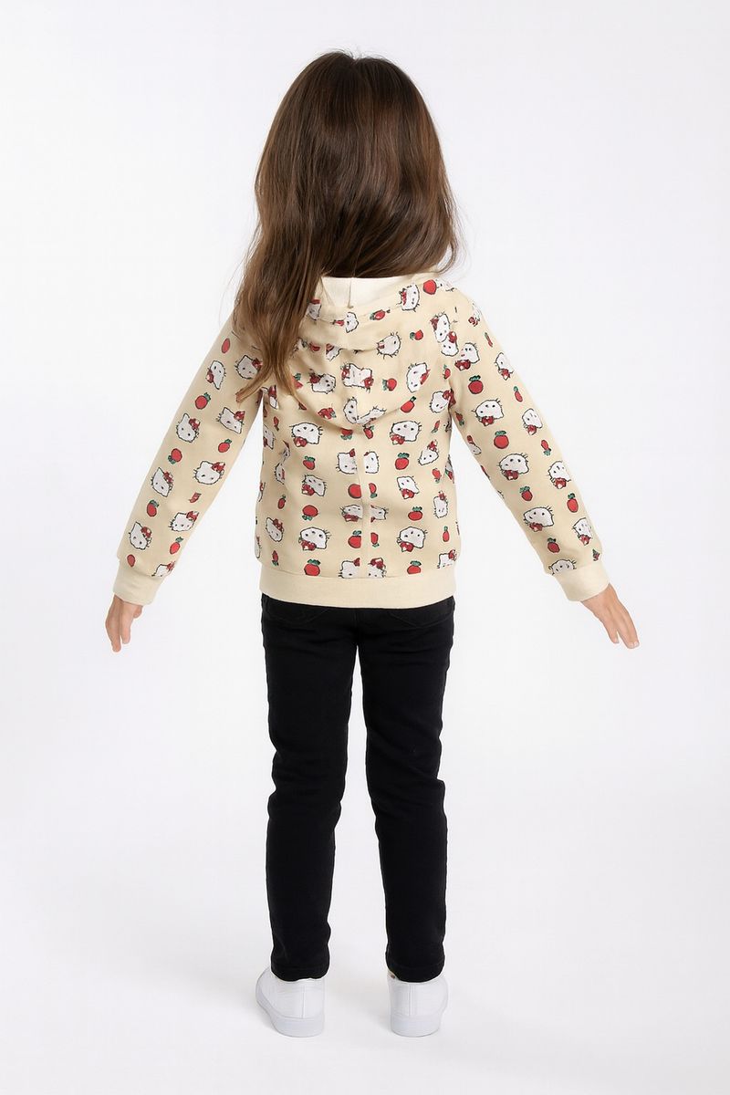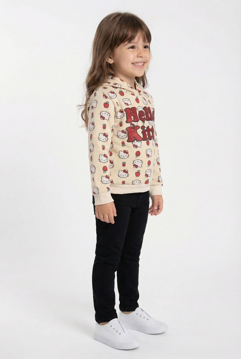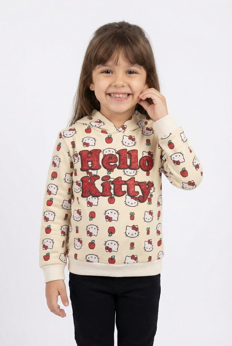 Conforto e moda se encontram no Blusão Infantil Hello Kitty Caedu. Em bege claro, um tom terroso que é pura tendência, esta blusa com capuz e estampa vibrante da Hello Kitty e maçãs é feita de moletom com felpa, ideal para um visual aconchegante e cheio de estilo.