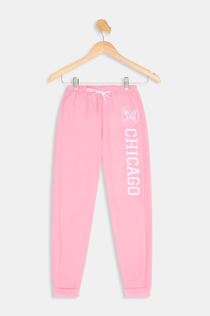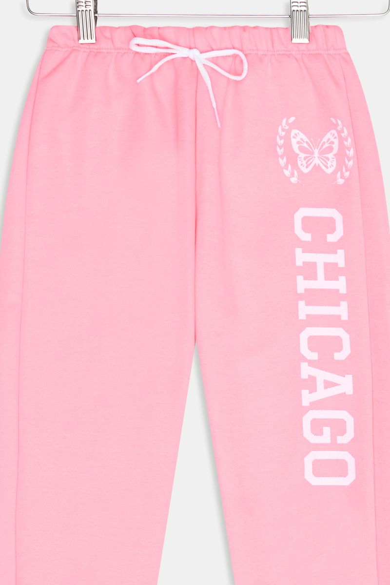 Detalhes: Cós elástico, cadarço, estampa "Chicago" com borboleta, punhos elásticos