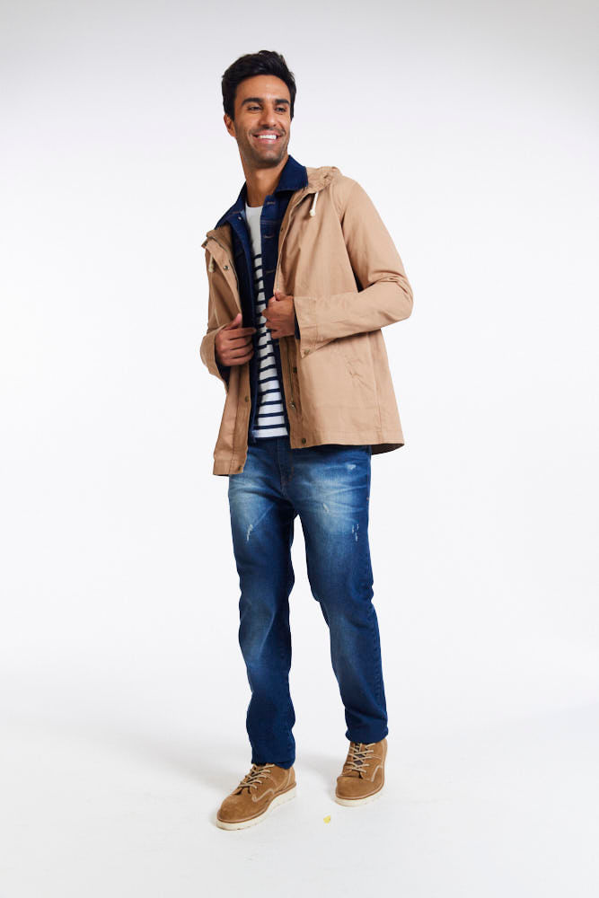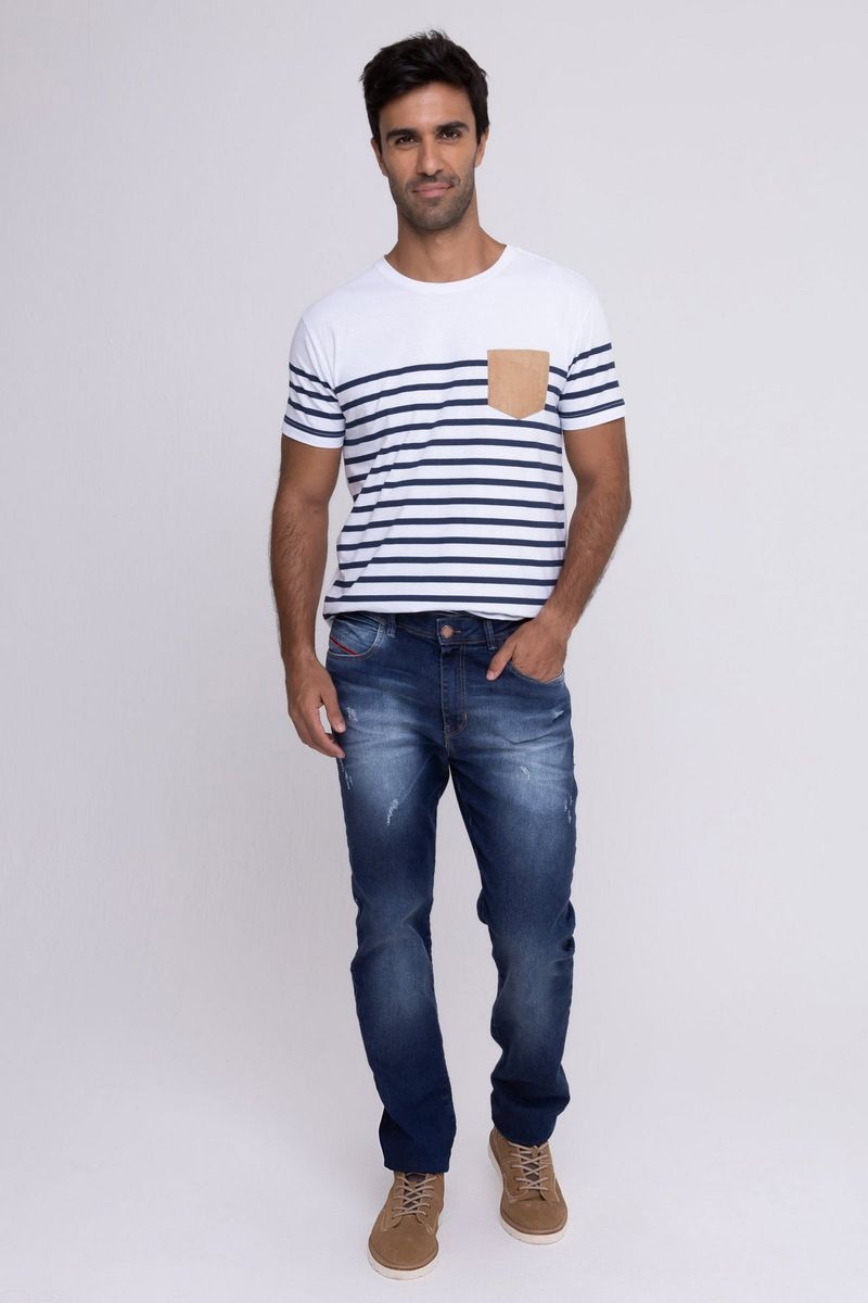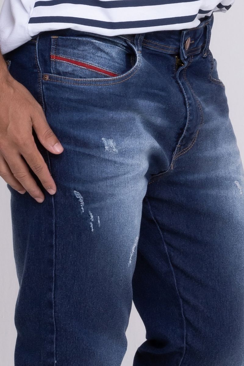 Calça masculina com modelagem slim, confeccionada em jeans. A peça possui fechamento por zíper e botão, bolsos frontais e traseiros.