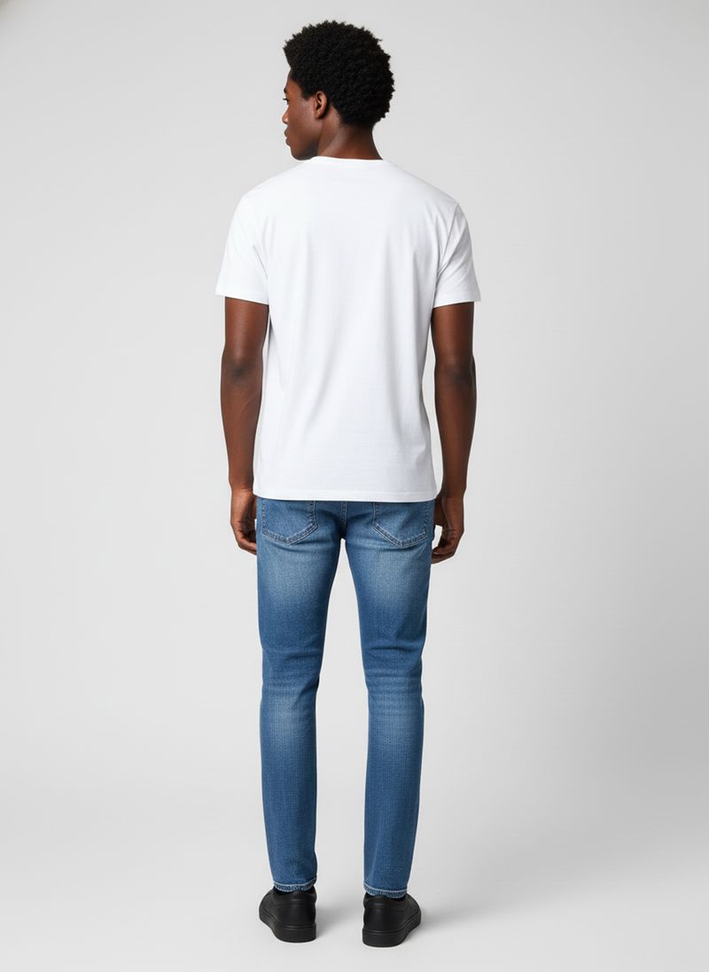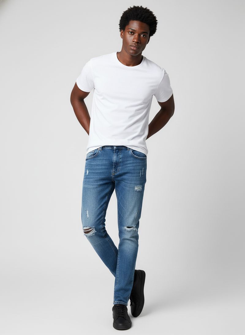 Combine sua Calça Jeans Masculina Skinny Destroyed Azul Médio Caedu com camisetas básicas para um visual despojado, ou com camisas polo para um toque mais arrumado. Para os pés, tênis casuais ou botas adicionam personalidade. Uma jaqueta jeans ou de couro complementa o look com estilo.