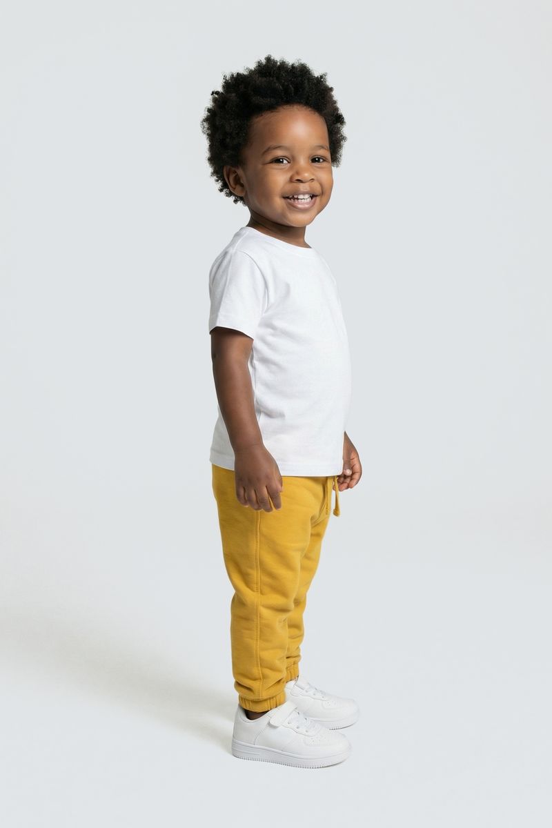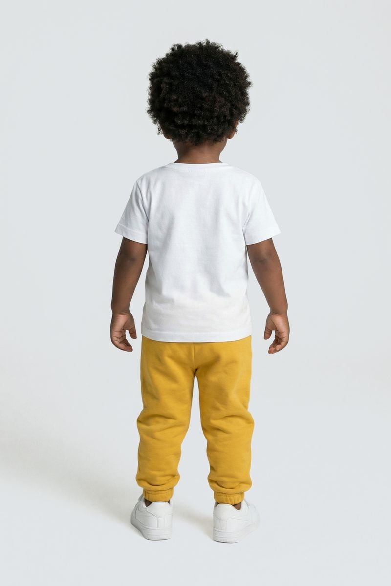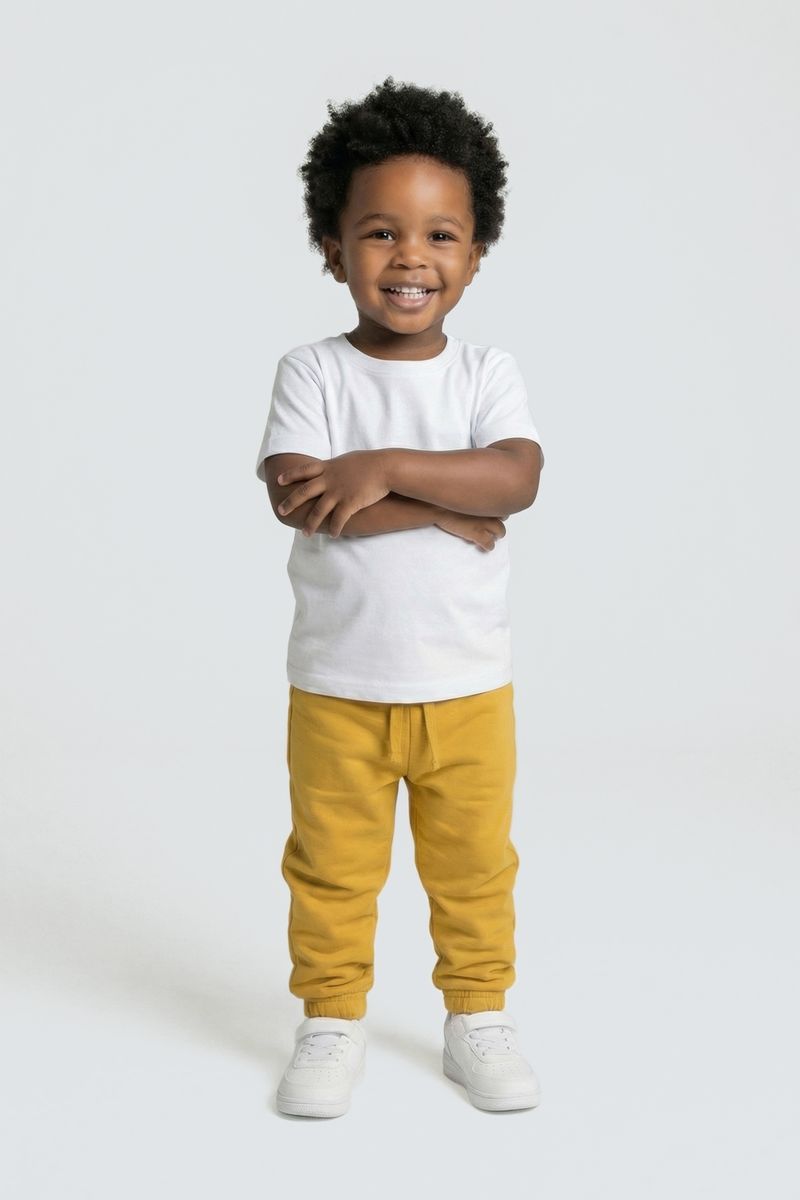 Combine a calça de moletom amarelo mostarda com blusas de cores neutras, como branco ou cinza, para um visual equilibrado. Para um toque despojado, adicione um tênis branco e uma jaqueta jeans leve. É a base perfeita para criar looks versáteis e cheios de personalidade para o seu pequeno, valorizando a roupa infantil da Caedu.