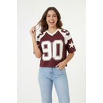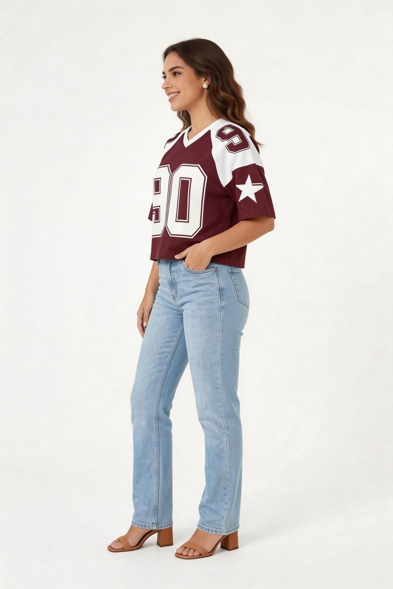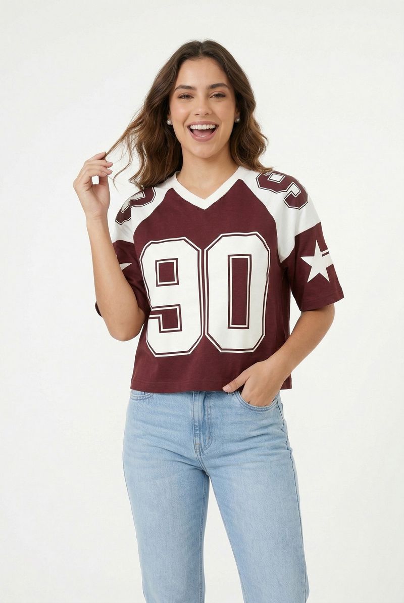 Detalhes: Estilo jersey, gola v, estampa "90" e estrelas nas mangas