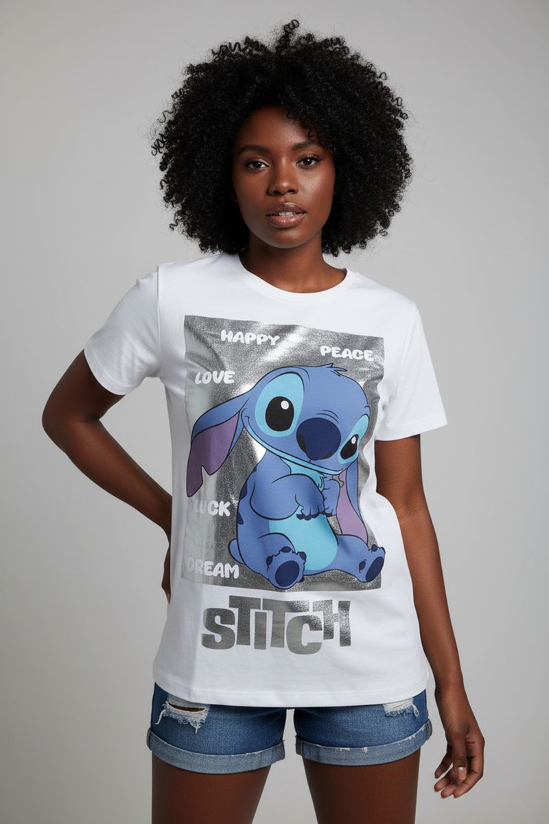 Estampa: Stitch Disney com foil prata e mensagens inspiradoras