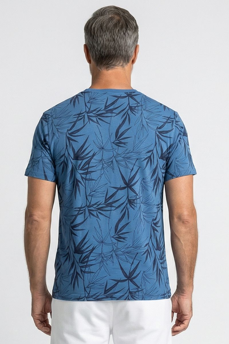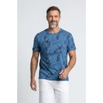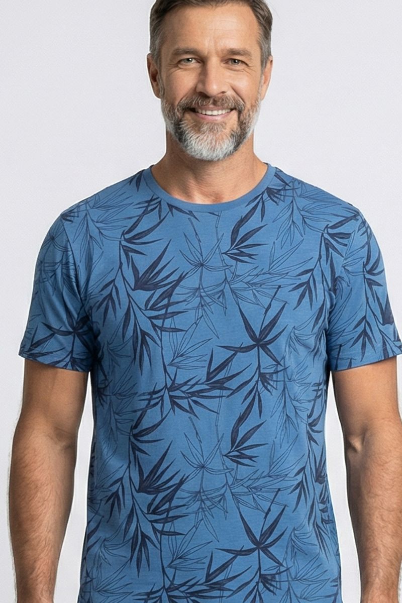 Descubra a Camiseta Masculina Full Print Azul com Estampa Botânica Caedu. Confeccionada em 100% algodão e meia malha, oferece conforto e um toque de elegância. Seu design com estampa de folhas em tons de azul é perfeito para um visual casual e moderno, ideal para quem busca roupa de moda com personalidade.