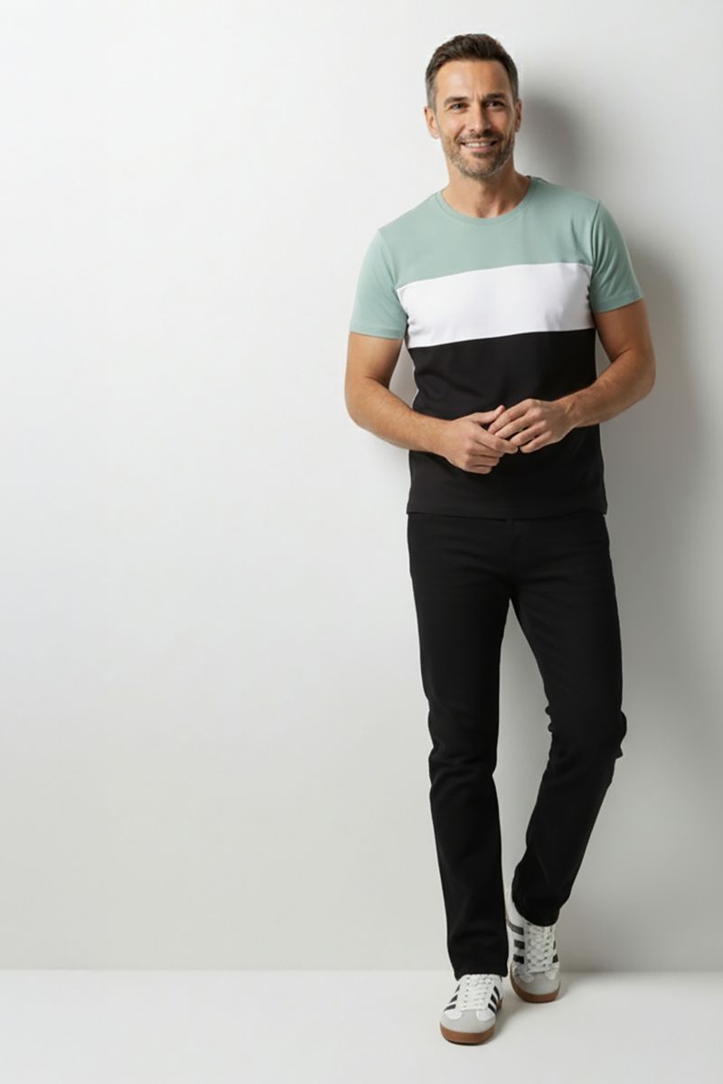 Descubra a Camiseta Masculina Color Block Caedu, a roupa perfeita para o seu dia a dia. Feita em 100% algodão, oferece estilo e conforto incomparáveis. Seu design moderno em verde menta, branco e preto é a moda que você busca com bom preço.