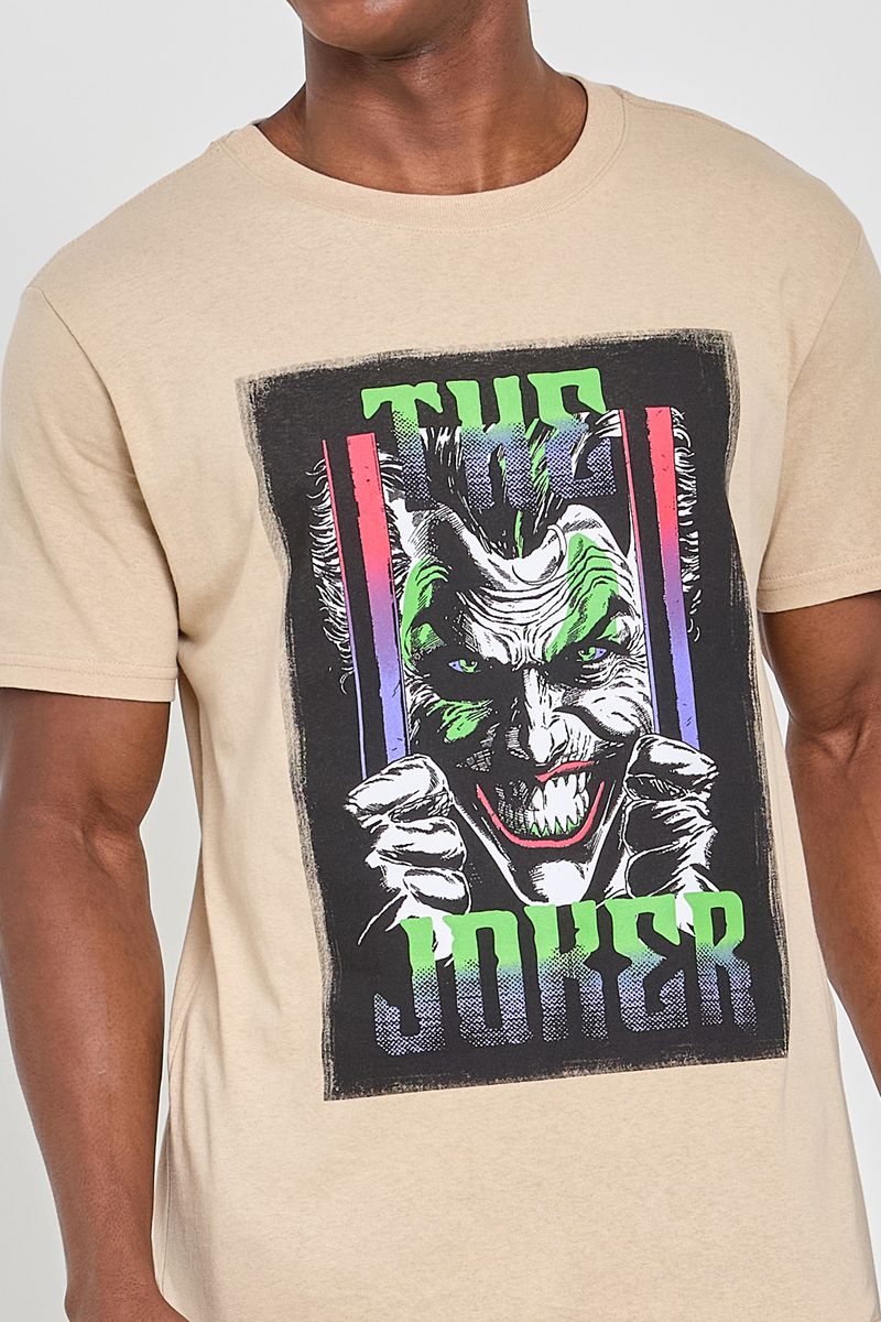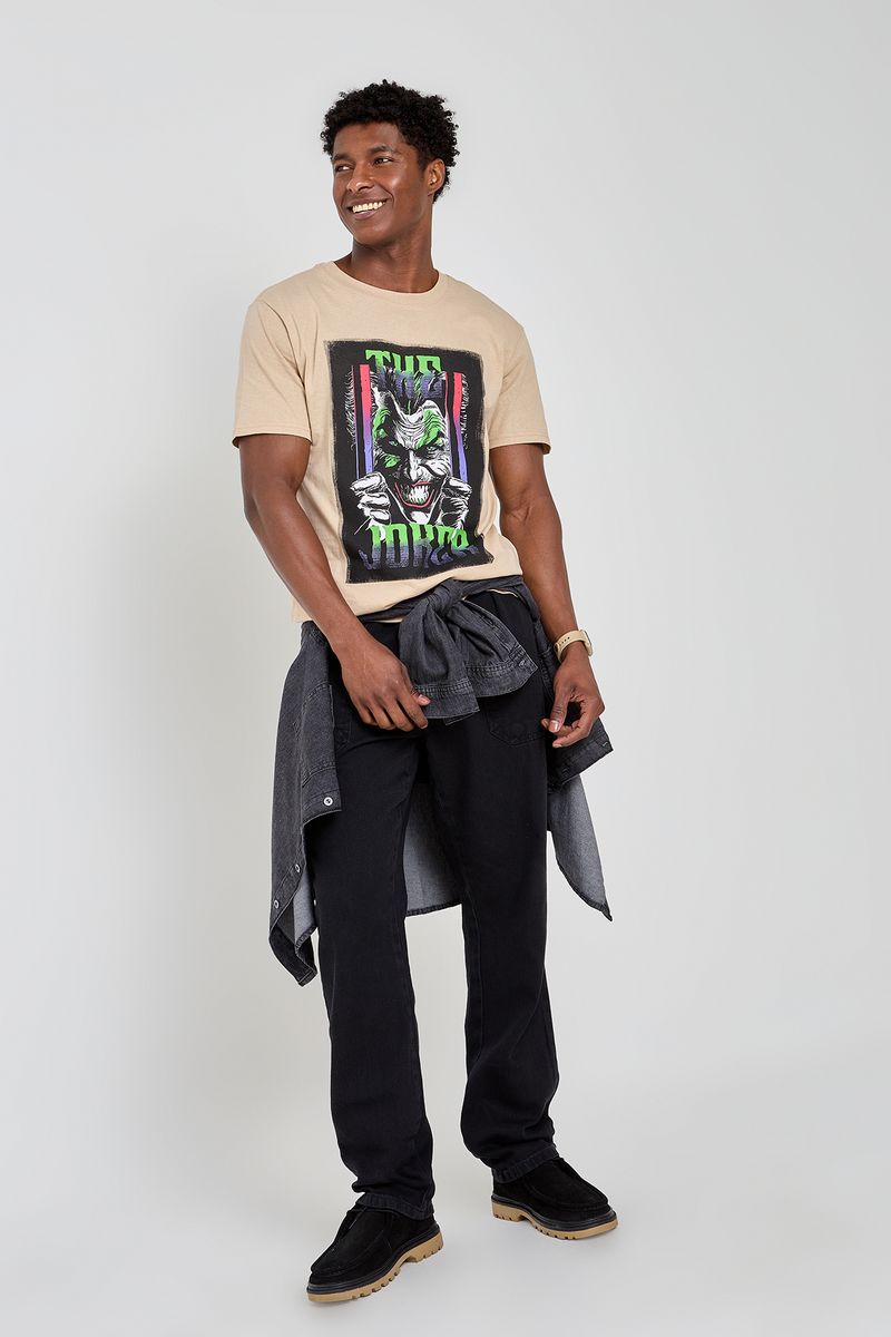 Combine sua camiseta Coringa com uma bermuda preta ou jeans para um look casual. Adicione tênis confortáveis e uma jaqueta leve para um toque extra de estilo, perfeito para diversas temperaturas e ocasiões descontraídas.