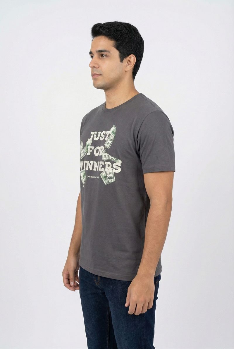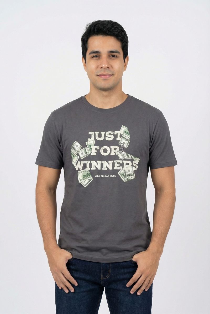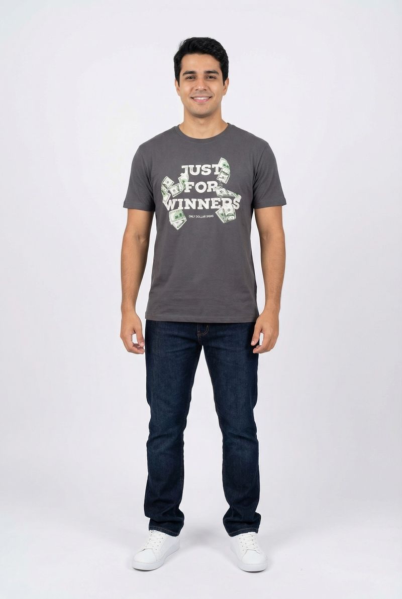 Destaque-se com a Camiseta Masculina Caedu 'Just For Winners'. Em meia malha 100% algodão, oferece conforto e estilo. A estampa com notas de dólar e "ONLY DOLLAR SIGNS" inspira sucesso, ideal para quem busca roupa com atitude.