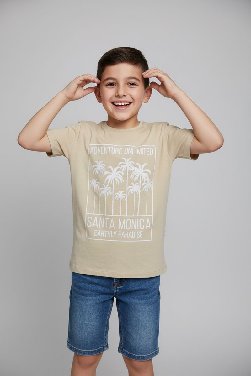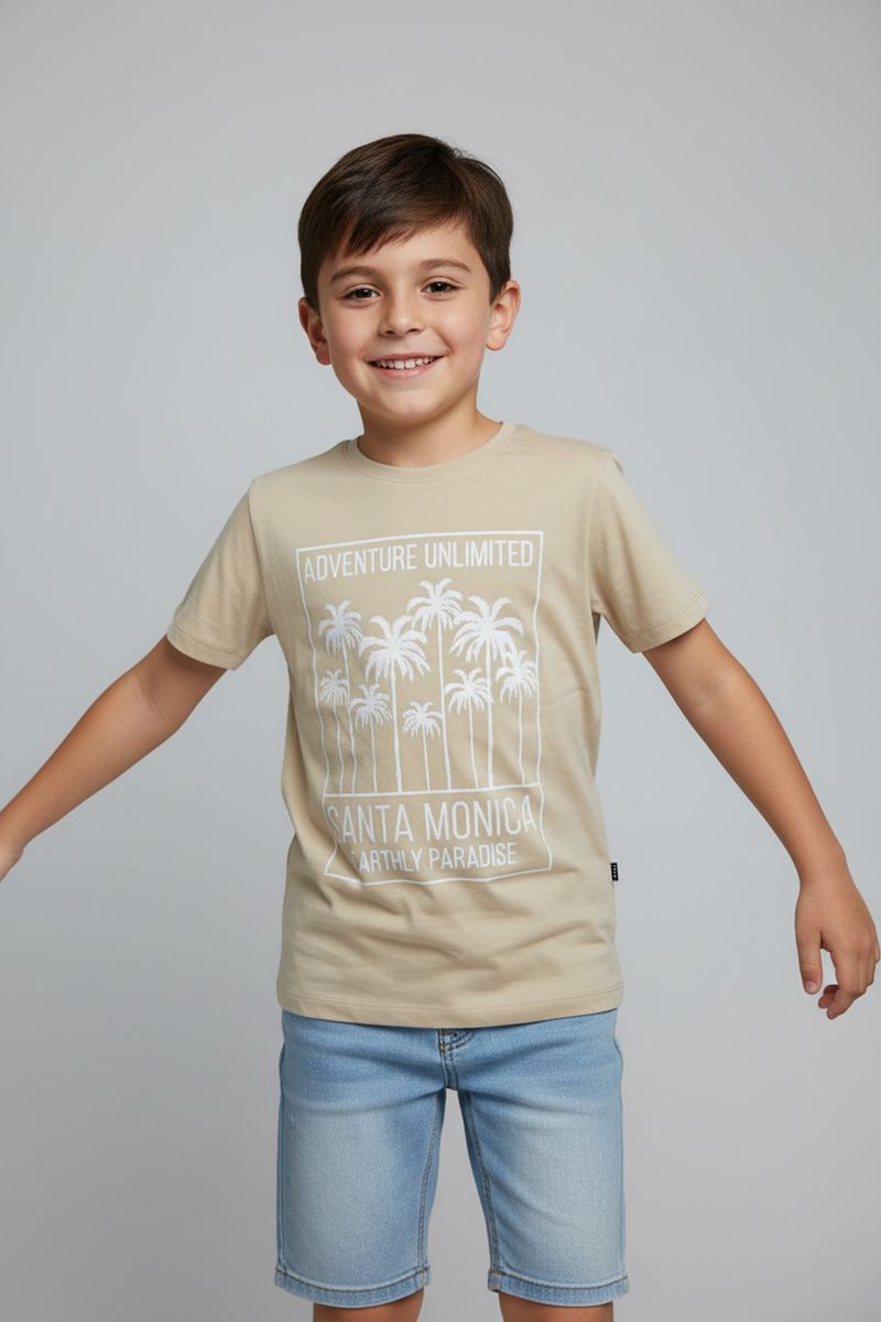 Esta camiseta infantil, 100% algodão, oferece conforto e estilo. Estampa 'Adventure Unlimited' e 'Santa Monica' inspira aventuras. Essencial na moda infantil.