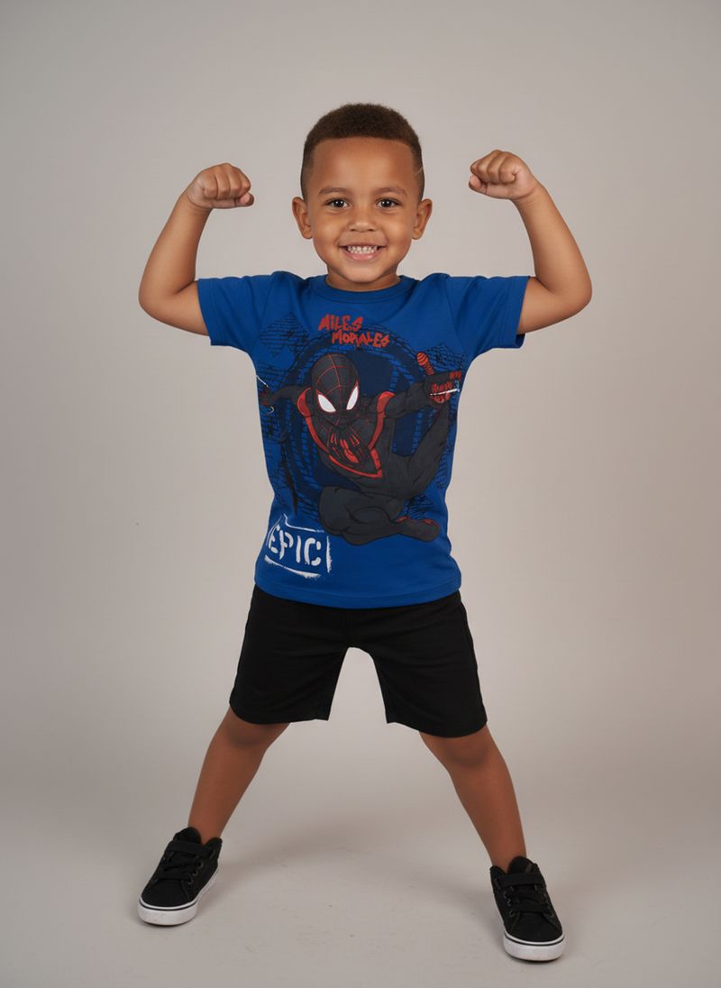 A Camiseta Infantil Miles Morales Spider-Man Azul Épica Caedu oferece conforto e estilo para os pequenos heróis. Feita em 100% algodão de meia malha, garante toque suave e durabilidade. Com estampa vibrante do Miles Morales, é a roupa infantil perfeita para aventuras diárias.