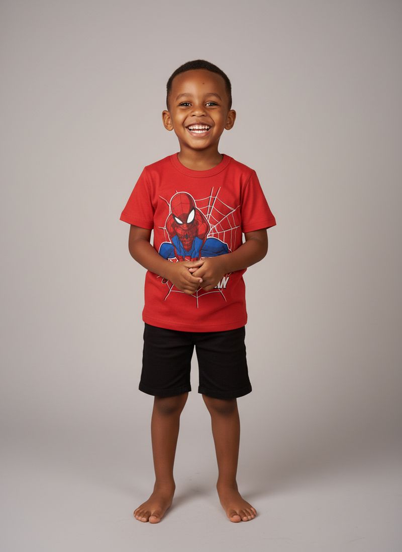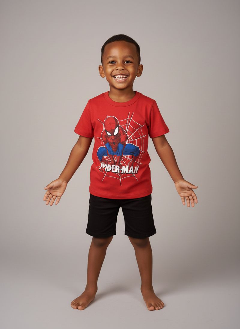 Combine a Camiseta Spider-Man com uma bermuda jeans para um visual casual e despojado. Para um toque extra de estilo, adicione um tênis colorido e um boné. Em dias mais frescos, uma jaqueta leve pode complementar o look, criando uma roupa versátil e cheia de personalidade para os meninos.