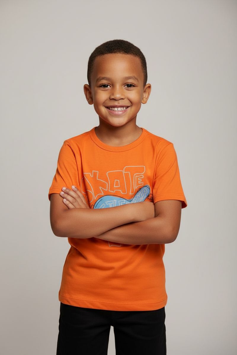 A Camiseta Infantil Laranja Skate Vibe Little Champ Caedu é ideal para pequenos aventureiros. Em 100% algodão e meia malha, oferece conforto e maciez. Com estampa "SKATE VIBE LITTLE CHAMP", seu filho terá estilo e liberdade para brincar.