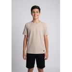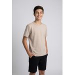 Combine a camiseta bege com shorts jeans ou de sarja para um visual despojado. Para um toque mais casual, aposte em calças pretas e tênis confortáveis. Uma jaqueta leve pode complementar o look em dias mais frescos, criando um visual moderno e prático para as crianças.