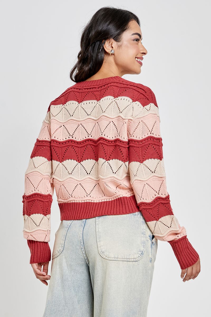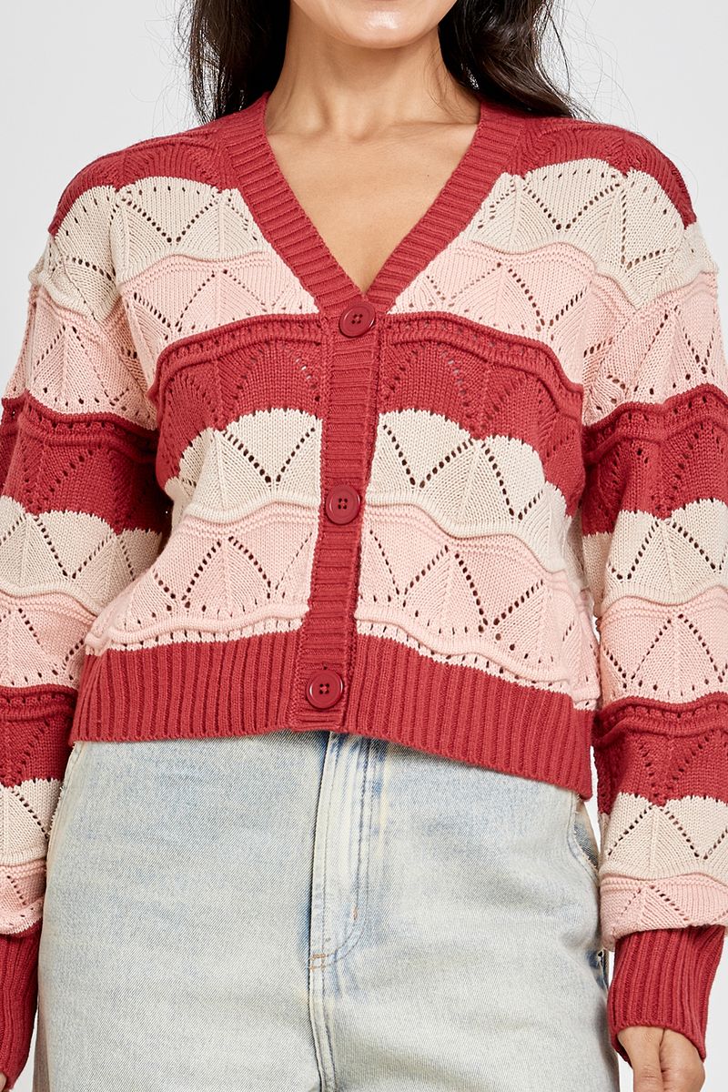 Cardigan Feminino Cropped Vermelho Rosa e Bege