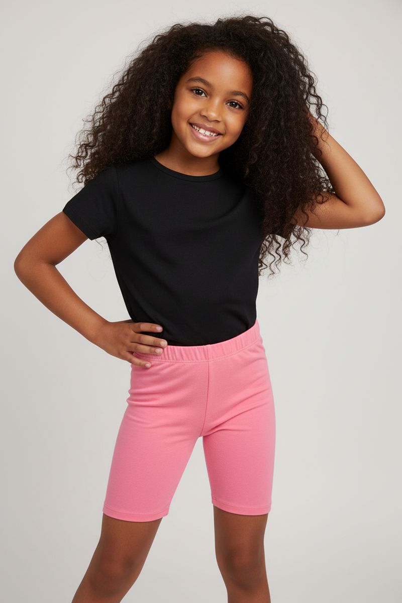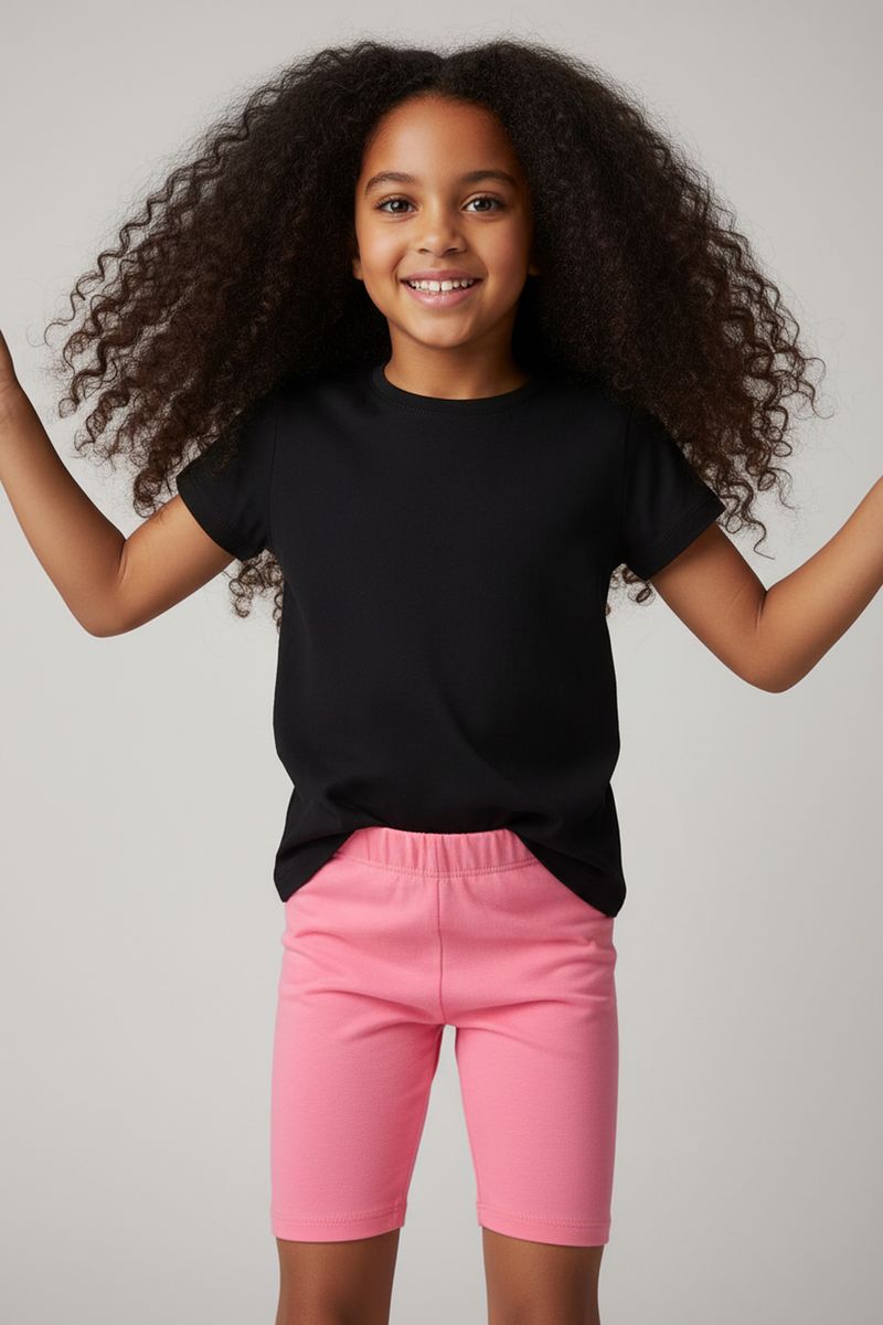 Combine o shorts ciclista rosa médio com blusas de algodão estampadas para um look divertido, ou com blusas lisas para um visual mais clássico. Complete com tênis confortáveis para brincar ou sandálias para um passeio. Para dias mais frescos, uma jaqueta jeans ou de moletom complementa o look com estilo e conforto, criando roupas versáteis para sua pequena.